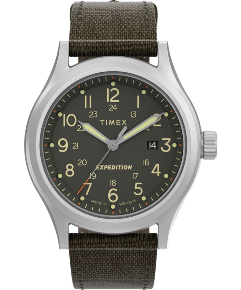 Мужские аналоговые кварцевые наручные часы. Коллекция Expedition North. Центральные часовая, минутная и секундная стрелки. Зелёный циферблат с часовыми индексами в виде арабских цифр. Стрелки и метки с люминесцентным покрытием, которое светится в темноте после непродолжительной зарядки на свету. Окошко даты находится в положении 3 часа. 12-ти и 24-х часовой формат времени. Фирменная подсветка Indiglo. Устойчивое к мелким механическим повреждениям минеральное стекло. Круглый корпус из нержавеющей стали. Диаметр корпуса 40 мм, толщина 11 мм. Рифленая переводная головка. Стальная задняя крышка. Зелёный тканевый ремешок с классической застежкой. Ширина ремешка 20 мм. Водозащита 100 WR (плавание и ныряние без акваланга).