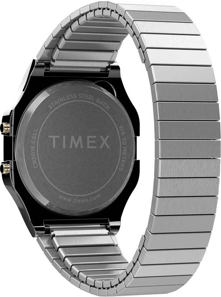 Кварцевые электронные часы с секундомером.. Коллекция T80. Унисекс. Точность секундомера 1/100 сек. Функция ежедневного будильника. Сегментный циферблат с фирменной подсветкой Indiglo (Indiglo-запатентованная технология компании Timex, представляющая собой электролюминесцентную панель нежно-зеленого или голубого цвета, с помощью которой подсвечивается весь циферблат). Автоматический календарь. Отображение числа, дня недели и месяца. Прямоугольный корпус из латуни. Размер корпуса 34 мм х 29 мм, толщина 10 мм Стальная задняя крышка крепится на 4-х винтах. Стальной браслет- резинка шириной 18 мм. Водозащита WR 30 (брызги).