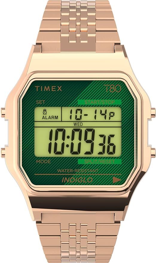 Кварцевые электронные часы с секундомером.. Коллекция T80. Унисекс. Точность секундомера 1/100 сек. Функция ежедневного будильника. Сегментный циферблат с фирменной подсветкой Indiglo (Indiglo-запатентованная технология компании Timex, представляющая собой электролюминесцентную панель нежно-зеленого или голубого цвета, с помощью которой подсвечивается весь циферблат). Автоматический календарь. Отображение числа, дня недели и месяца. Прямоугольный корпус из латуни с PVD покрытием цвета розового золота. Размер корпуса 34 мм х 29 мм, толщина 10 мм. Стальная задняя крышка крепится на 4-х винтах. Стальной браслет с PVD покрытием цвета розового золота шириной 18 мм, раскладная застежка. Водозащита WR 30 (брызги).