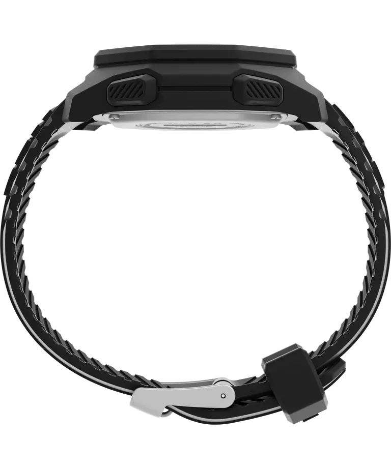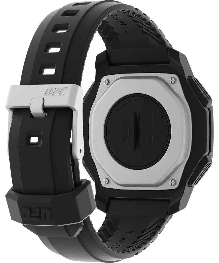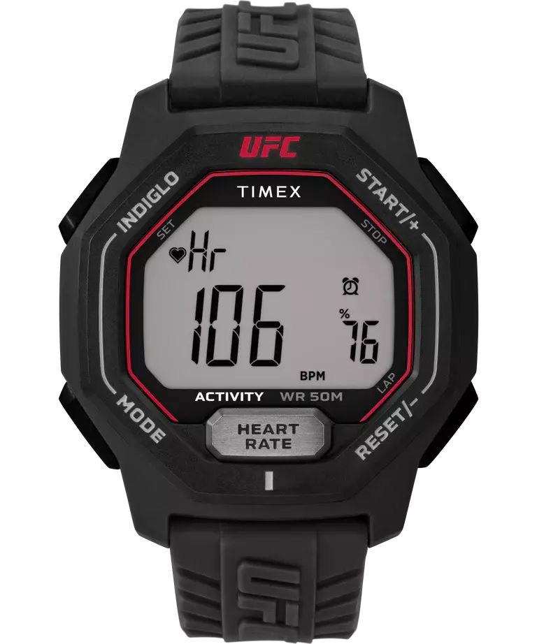 Кварцевые электронные часы-хронограф с секундомером. Коллекция UFC Spark. Циферблат с подсветкой INDIGLO® - люминесцентная панель освещает весь дисплей при нажатии на переводную головку. Часы оснащены шагомером, датчиком сердечного ритма Easy Touch (измеряет частоту пульса), секундомером, таймером обратного отсчёта, двумя ежедневными будильниками. Восьмиугольный корпус выполнен из полимерного пластика чёрного цвета. Чёрный пластиковый ремешок шириной 22 мм. Пластиковое стекло. Водонепроницаемость 50 WR (мытьё рук, дождь).