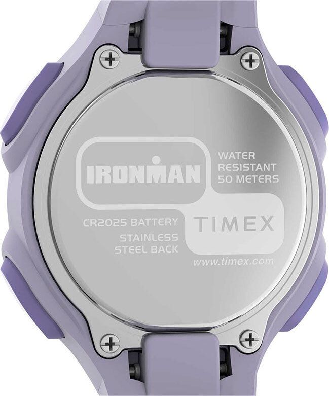 Кварцевые электронные наручные часы-хронограф с секундомером. Унисекс. Коллекция Ironman. Электронный SPLIT-хронограф с секундомером точностью 1/100с и памятью на 30 кругов. Таймер обратного отсчета. 12-ти и 24-х часовой формат отображения времени. Функция ежедневного будильника. Сегментный дисплей с фирменной подсветкой Indiglo -запатентованная технология компании Timex, представляющая собой электролюминесцентную панель, с помощью которой подсвечивается весь дисплей. Круглый пластиковый корпус фиолетового цвета со стальной вставкой. Диаметр корпуса 34мм, толщина 9 мм. Фиолетовый пластиковый ремешок с классической застежкой buckle. Ширина ремешка 9 мм. Водозащита 50WR (мытьё рук, дождь).