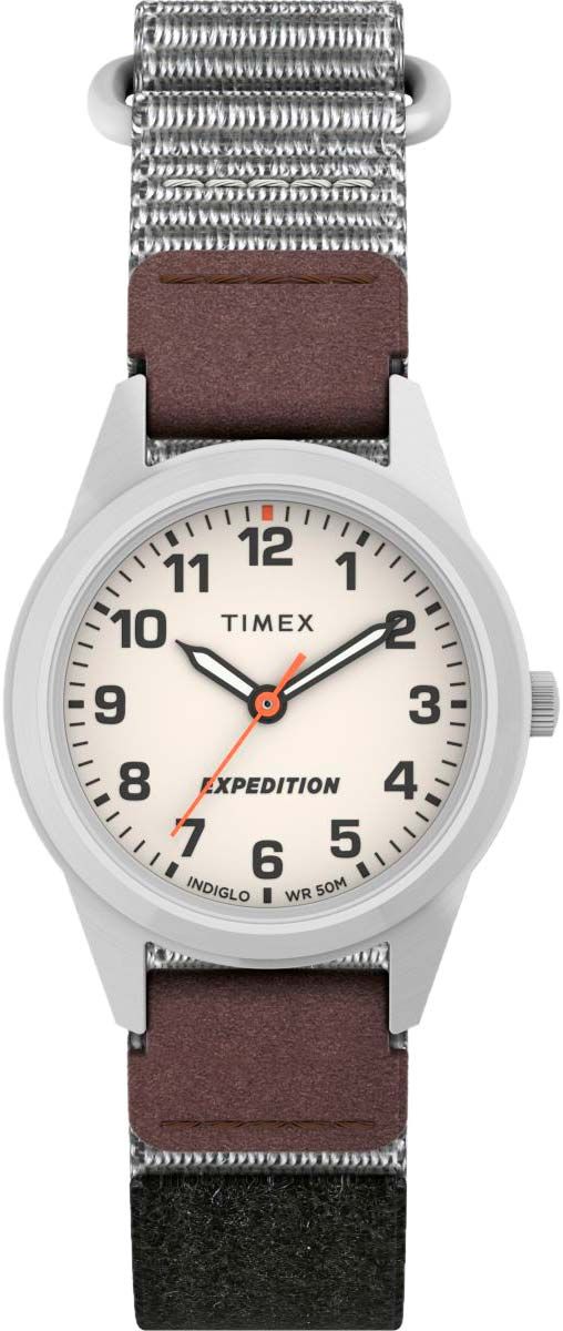 Кварцевые аналоговые наручные часы. Коллекция Expedition. Унисекс. Центральные часовая, минутная и секундная стрелки. Бежевый циферблат с часовыми метками в виде арабских цифр. Подсветка Indiglo. Стрелки с люминесцентным покрытием, которое светится в темноте после непродолжительной зарядки на свету. Круглый корпус диаметром 26 мм. Устойчивое к мелким механическим повреждениям минеральное стекло. Рифленая переводная головка. Стальная задняя крышка. Текстильный ремешок на липучке. Ширина ремешка 12 мм. Водозащита WR50 (мытьё рук, дождь).