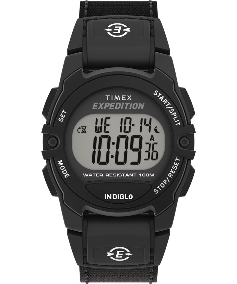 Кварцевые электронные часы-хронограф с секундомером. Коллекция Expedition. Циферблат с подсветкой INDIGLO® - люминесцентная панель освещает весь дисплей при нажатии на переводную головку. Часы оснащены хронографом (секундомером), будильником и таймером обратного отсчета. Круглый корпус выполнен из полимерного пластика чёрного цвета. Диаметр корпуса 33 мм, толщина 11 мм. Чёрный тканевый ремешок шириной 16 мм, классическая застёжка. Пластиковое стекло. Стальная задняя крышка крепится на 4-х винтах. Водонепроницаемость 100 WR (плавание и погружение без акваланга).