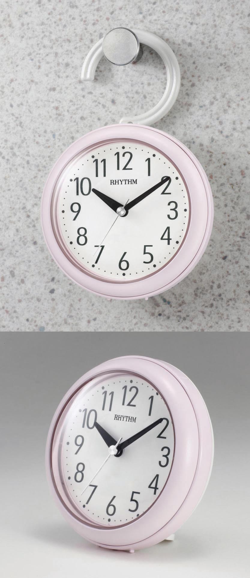 Кварцевые влагозащищенные часы Rhythm 4KG711WR13. Возможность повесить за полотенцесушитель с помощью специального крючка или поставить на стол с помощью специальной подставки (входит в комплект). Разрешается использовать в помещениях с повышенной влажностью. Данная модель работает от батарейки типа R6 (AA) x 1 шт. (входит в комплект). Корпус выполнен из пластика. Максимально допустимая погрешность точности хода +30/-30 секунд в месяц. Ход секундной стрелки — дискретный (тикают). Форма стекла — выпуклое.