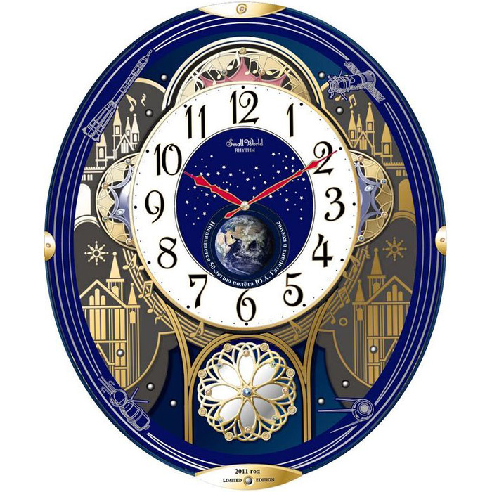Кварцевые музыкальные настенные часы Rhythm 4MH856WA11. Серия Magic. В момент проигрывания мелодий циферблат приводится в движение и меняет своё расположение. Данная модель работает от батареек типа R20(D) x 2 шт. (входят в комплект). 30 ежечасных мелодий — 24 классических и 6 Рождественских. Плавная регулировка громкости мелодий. Автоматический выключение звука в тёмное время суток. Корпус выполнен из пластика. Вращающийся маятник украшен кристаллами Swarovski. Максимально допустимая погрешность точности хода +30/-30 секунд в месяц. Ход стрелки — плавный (бесшумный).