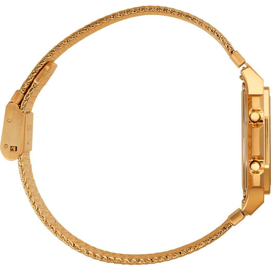Электронные часы. Светодиодная подсветка. Функция секундомера с точностью 1/100 секунды и пределом измерения 1 час. Ежедневный будильник. Автоматический календарь. 12/24х часовой формат времени. Корпус выполнен из нержавеющей стали с IP покрытием. Размер корпуса 38 мм х 40 мм х 7 мм. Браслет миланского плетения, выполнен из нержавеющей стали с IP покрытием. Раскладывающаяся застежка. Прочное минеральное стекло устойчивое к мелким механическим повреждениям. Водостойкость WR 30 (брызги). Вес примерно 70 гр. Срок службы батареи - 3 года.