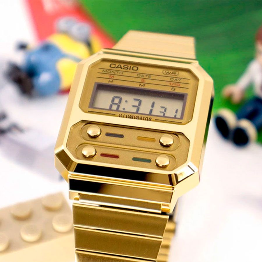 Кварцевые электронные часы. Коллекция Vintage. Унисекс часы. Циферблат подсвечивается светодиодом. Секундомер с точностью показаний 1/10с и временем измерения 1ч. Ежедневный будильник, сигнал начала часа, продолжительность звучания сигнала будильника 20 секунд. Автоматический календарь,учитывающий 28 дней в феврале. Пластиковое стекло. Корпус из полимерного пластика цвета жёлтого золота. Размеры корпуса 32,7 мм на 40,7мм, толщина 9,2мм. Стальной браслет с IP покрытием цвета жёлтого золота, регулируемая застежка. Батарея рассчитана на 3 года. Водонепроницаемость 30WR (защита от брызг). Вес около 26 г.