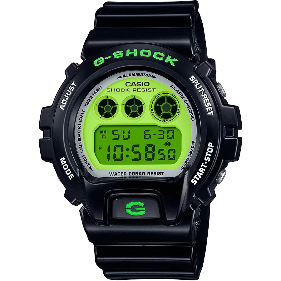 Кварцевые электронные наручные часы. Серия Casio G-Shock Crazy Colors. Унисекс. Противоударный корпус защищает механизм часов от ударов и вибрации. 12-ти и 24-х часовой формат отображения времени. Секундомер с точностью показаний 1/100 секунды (первые 60 минут) и 1 секунда (через 60 минут) и временем измерения 24 часа. Режимы измерения: прошедшее время, промежуточное время, два финишных результата. Таймер обратного отсчета от 1 с до 24 ч (с интервалом в 1 секунду, с интервалом в 1 минуту и с интервалом в 1 час) с автоповтором. Светодиодная подсветка, послесвечение. 4 многофункциональных будильника (ежедневный, датированный, ежемесячный, для каждого дня определенного месяца), один с функцией повтора сигнала. Автоматический календарь до 2099 года. Световая индикация сигнала (LED-индикатор)- светодиодная лампочка начинает мигать при сигнале будильника, окончании таймера обратного отсчета или секундомера. Круглый корпус из полимерного пластика чёрного цвета. Размеры корпуса 50 мм на 53,2 мм , толщина 18,7 мм. Устойчивое к мелким механическим повреждениям минеральное стекло. Чёрный пластиковый ремешок с классической застёжкой buckle. Срок службы батареи рассчитан на 5 лет. Водозащита WR200 (плавание и погружение без акваланга). Вес примерно 72 г.