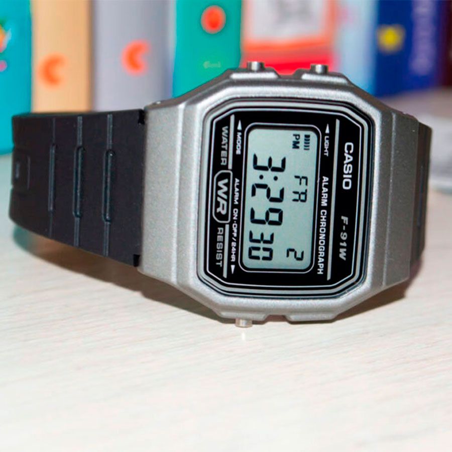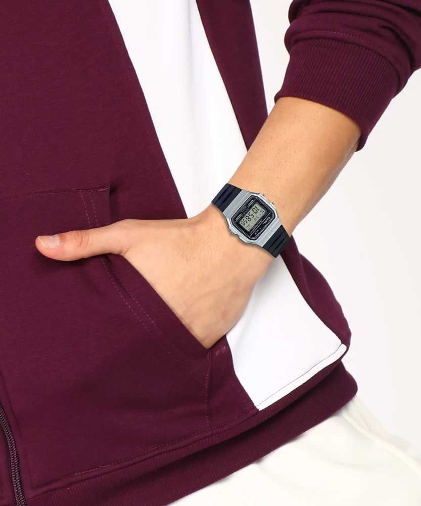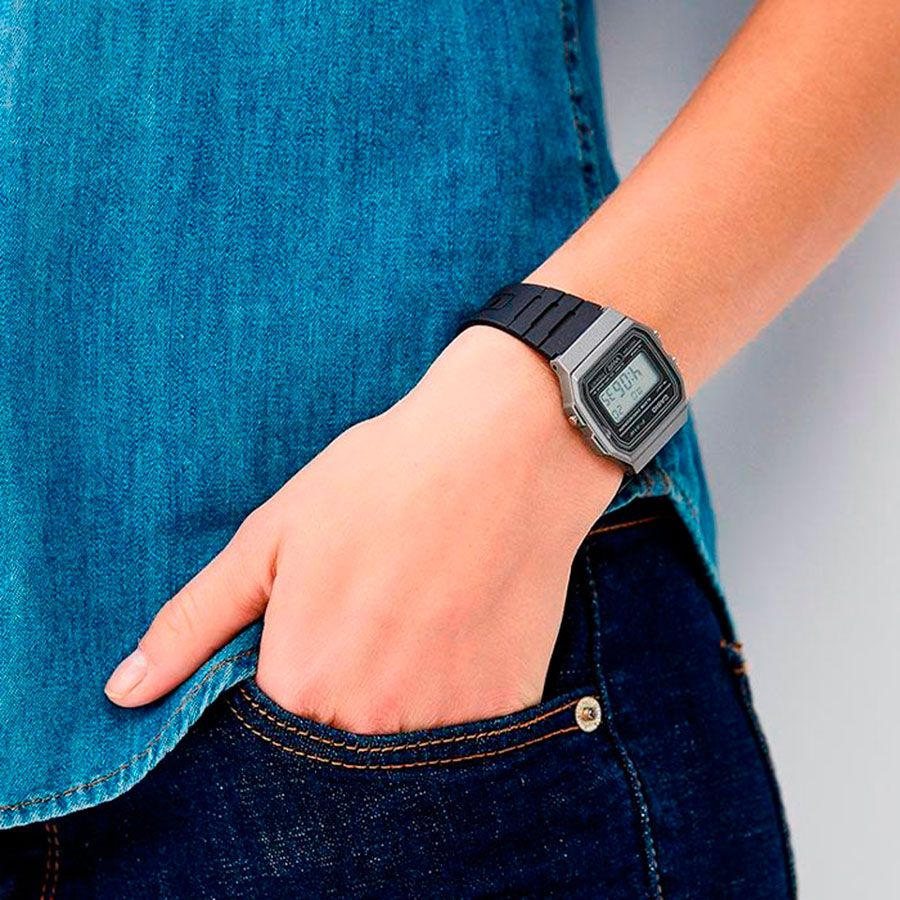 Кварцевые электронные наручные часы. Серия Casio Collection. Унисекс часы. Дисплей подсвечивается светодиодом, цвет подсветки зеленый. 12-ти и 24-х часовой формат отображения времени. Секундомер с точностью показаний 1/100 с и временем измерения 1ч. Режимы измерения: прошедшее время, промежуточное время, два финишных результата. Ежедневный будильник, ежечасный сигнал. Автоматический календарь с установкой 28 дней на февраль. Прямоугольный пластиковый корпус серого цвета. Размеры корпуса 38,2мм на 35,2 мм, толщина 8.5 мм. Пластиковое стекло. Чёрный пластиковый ремешок с классической застежкой buckle. Срок службы батареи около 7 лет. Водонепроницаемость WR30 ( защита от брызг). Вес около 21 г.