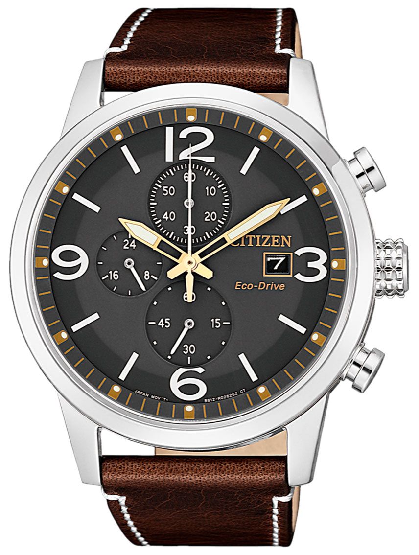 Мужской кварцевый хронограф. Часы оснащены системой Eco-Drive не требующей замены батарейки. Питание от солнечной энергии, запас хода 7 месяцев. Функция предотвращения перезарядки. Функция индикации заряда (EOL). Калибр механизма Citizen B612. Центральные часовая и минутная стрелки, секундная стрелка вынесена на малый циферблат. Апертура даты в позиции 3 часов. 12/24х часовой формат времени. Секундомер. Черный циферблат. Круглый корпус выполнен из нержавеющей стали. Диаметр корпуса составляет 44 мм. Кожанный ремешок. Прочное минеральное стекло устойчивое к мелким механическим повреждениям. Водостойкость WR 100 (плавание без погружения).