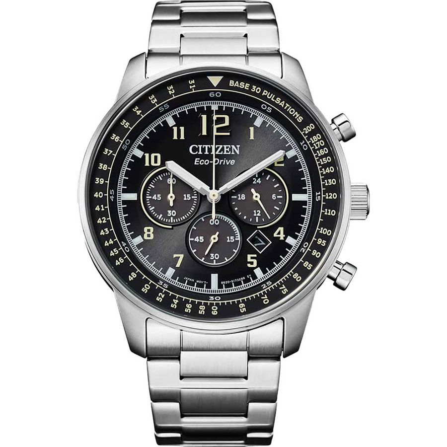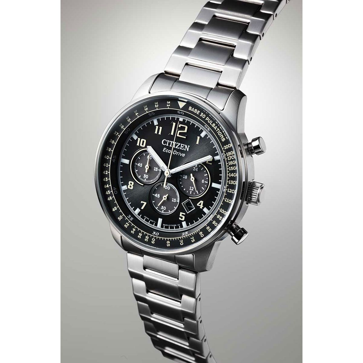 Мужской кварцевый хронограф. Калибр механизма Citizen B620. Система Eco-Drive, не требующая замены батарейки. Питание от солнечной энергии, запас энергии на 6 месяцев. Функция индикации заряда (EOL). Функция предотвращения перезарядки. Центральные часовая и минутная стрелки, секундная стрелка вынесена на малый циферблат. Апертура даты между 4 и 5 часами. 12/24х часовой формат времени. Секундомер. Шкала измерения сердцебиения. Черный циферблат. Арабская индикация времени. Люминесцентные стрелки и часовые метки. Круглый корпус выполнен из нержавеющей стали. Диаметр корпуса составляет 44 мм, толщина 13 мм. Стальной браслет, раскладывающаяся застежка. Прочное минеральное стекло устойчивое к мелким механическим повреждениям. Водостойкость WR 100 (плавание без погружения).