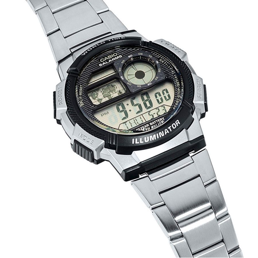 Мужские кварцевые электронные наручные часы. Коллекция Standard Digital. Циферблат подсвечивается светодиодом c функцией послесвечения. Секундомер с точностью показаний 1/100 секунды и временем измерения 24 ч. Режимы измерения: прошедшее время, промежуточное время, два финишных результата. Таймер обратного отсчета от 1c до 24ч. 5 независимых будильников, сигнал начала часа. Включение/выключение звука кнопок (Mute). Автоматический календарь до 2099 года. 12/24-х часовой формат отображения времени. Мировое время - 48 городов (31 часовой пояс), всемирное координированное время (UTC), установка летнего/стандартное времени, переключение между домашним и мировым временем. Режим WorldTime — показания текущего времени в 4-х зафиксированных городах. Круглый корпус из полимерного пластика серебристого цвета. Размеры корпуса 48,1 мм на 43,7 мм, толщина 13,7 мм. Пластиковое стекло. Стальной браслет с тройной раскладывающейся застежкой. Батарейка рассчитана на 10 лет. Водонепроницаемость 100 WR (часы подходят для плавания с маской, трубкой и обычного плавания). Вес около 96 г