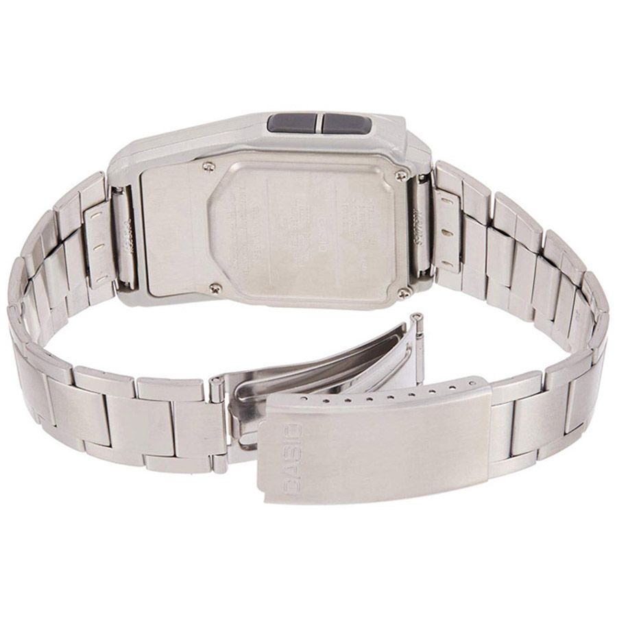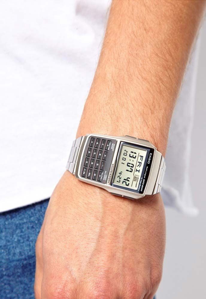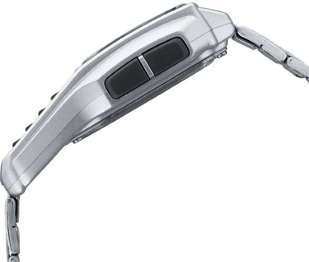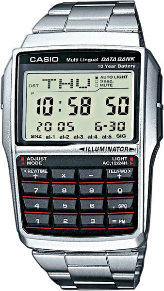 Мужские кварцевые электронные наручные часы. Серия Data Bank. Автоматическая светодиодная подсветка - поворот руки при недостаточном освещении обеспечит автоматическое включение подсветки дисплея. 12-ти и 24-х часовой формат отображения времени. Телефонная книжка на 25 ячеек памяти, индикация оставшихся свободных записей. 8-ми разрядный калькулятор. Конвертер валют - возможность перевода суммы из одной валюты в другую по введенным курсам обмена. Второй часовой пояс (часовая опция, позволяющая отображать время двух часовых поясов одновременно), режим летнего времени (DST). Секундомер с точностью показаний 1/100с и временем измерения 24ч. Режимы измерений: отдельные отрезки времени, время с промежуточным результатом, два финишных результата. Будильник с пятью многофункциональными звуковыми сигналами, функция повтора сигнала Snooze, ежечасный сигнал. Автоматический календарь до 2099 г, возможность отображения дней недели на разных языках. Включение/выключение звука кнопок. Выбор языка ввода и представления текста на дисплее. Прямоугольный пластиковый корпус серебристого цвета. Размеры корпуса 37.4 мм на 50.4 мм, толщина 12 мм. Пластиковое стекло. Стальной браслет с тройной раскладывающейся застёжкой. Батарейка рассчитана на 10 лет. Водонепроницаемость WR30 (защита от брызг). Вес около 63 г.