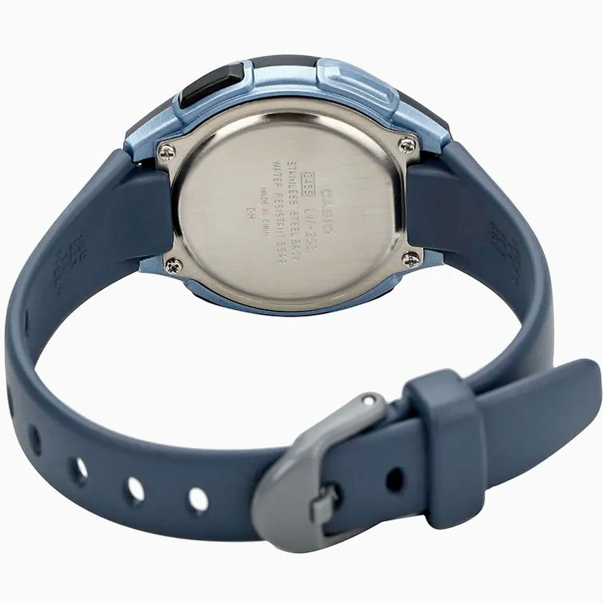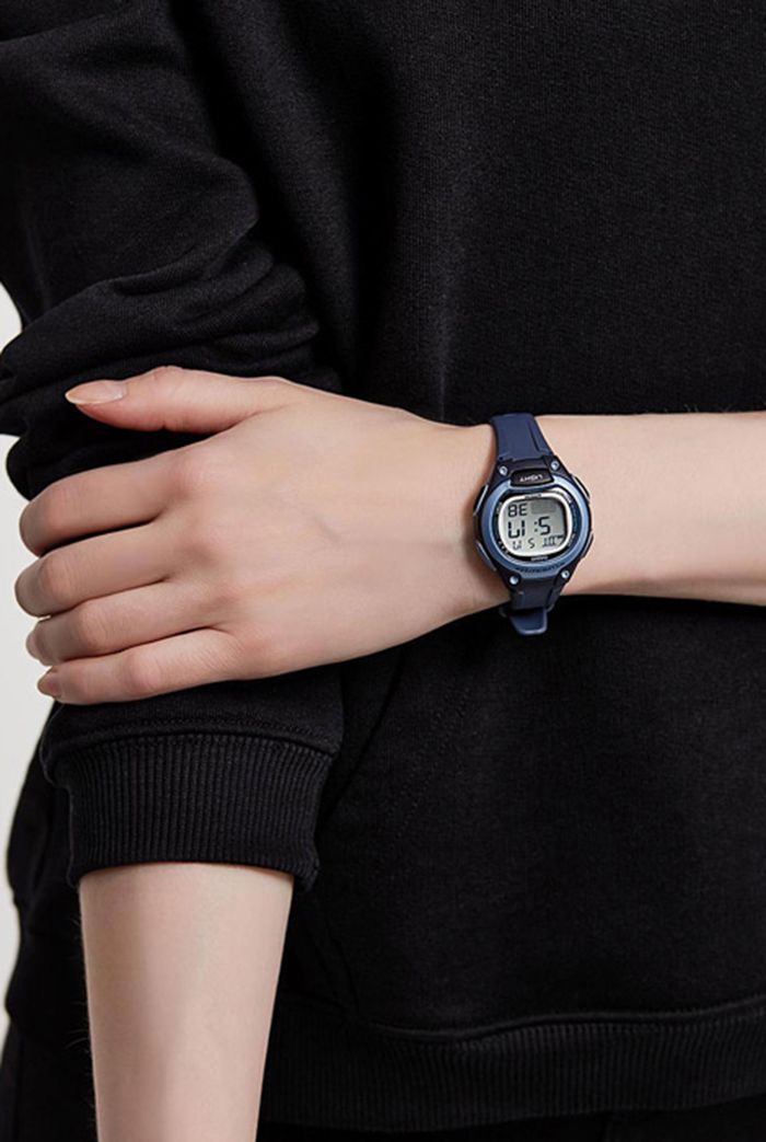 Женские кварцевые электронные наручные часы. Серия Casio Collection. Циферблат подсвечивается светодиодом, настройка продолжительности подсветки 1,5 или 3 секунды. 12/24 часовой формат отображения времени. Второй часовой пояс. Секундомер с точностью показаний 1/100 секунды и временем измерения 24 ч. Режимы измерения: отдельные отрезки времени, разделенное время, два финишных результата. Ежедневный будильник, ежечасный сигнал. Автоматический календарь до 2099 года. Пластиковое выпуклое стекло. Пластиковый корпус размером 38,1 мм на 34,6мм, толщиной 11,3мм. Синий пластиковый ремешок с классической застежкой buckle. Батарея рассчитана на 10 лет. Водонепроницаемость 50WR (мытьё рук, дождь). Вес около 20 г.