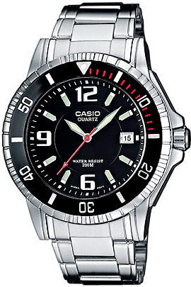 Мужские кварцевые аналоговые наручные часы. Diver Look. Центральные часовая, минутная и секундная стрелки. Чёрный циферблат с часовыми метками в виде штрихов и трёх арабских цифр 6, 9 и 12. Стрелки и метки с люминесцентным покрытием, которое светится в темноте после непродолжительного воздействия света. Окошко даты в положении 3 ч. Устойчивое к мелким механическим повреждениям минеральное стекло. Круглый стальной корпус размером 42,6 мм на 48мм, толщиной 11.5 мм. Чёрный безель с минутной шкалой и с односторонним вращением. Завинчивающаяся переводная головка с защитой в положении 3 ч. Стальной браслет с тройной раскладывающейся застежкой. Закручивающаяся задняя крышка. Водонепроницаемость 200WR (плавание и погружение без акваланга). Вес около 142 г.