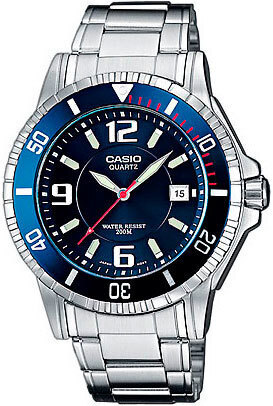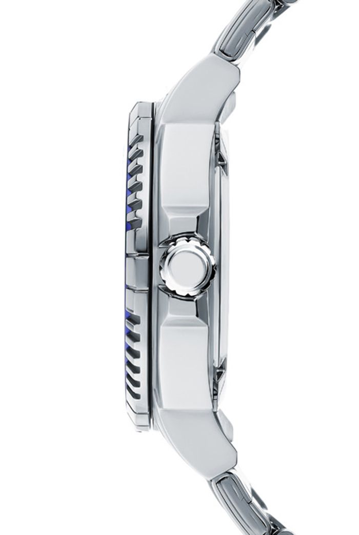 Мужские кварцевые аналоговые наручные часы. Серия Diver Look. Центральные часовая, минутная и секундная стрелки. Синий циферблат с часовыми метками в виде штрихов и трёх арабских цифр 9, 6 и 12. Стрелки и метки с люминесцентным покрытием, которое светится в темноте после непродолжительного воздействия света. Окошко даты в положении 3 ч. Устойчивое к мелким механическим повреждениям минеральное стекло. Круглый стальной корпус размером 42,6 мм на 48мм, толщиной 11.5 мм. Безель с минутной шкалой и с односторонним вращением. Завинчивающаяся переводная головка с защитой в положении 3 ч. Стальной браслет с тройной раскладывающейся застежкой. Закручивающаяся задняя крышка. Водонепроницаемость 200WR (плавание и погружение без акваланга). Вес около 142 г.