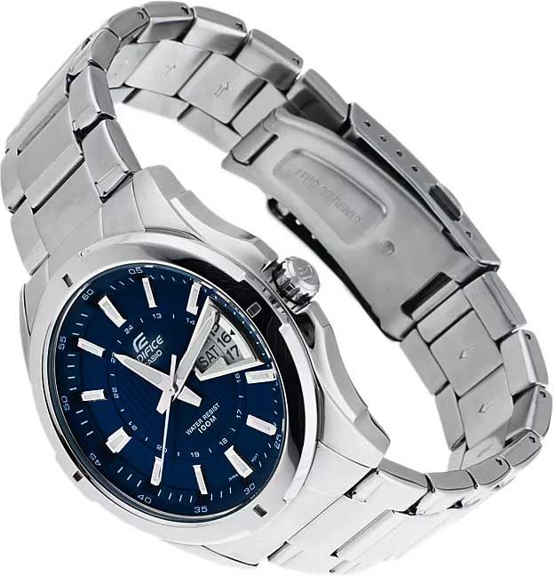 Мужские кварцевые аналоговые наручные часы. Серия Casio Edifice. Центральные часовая, минутная и секундная стрелки. Синий циферблат с часовыми метками в виде штрихов. Стрелки и метки с люминесцентным покрытием, которое светится в темноте после непродолжительного воздействия света. Устойчивое к мелким механическим повреждениям минеральное . Окошко даты и дня недели в позиции 3 ч. 12-ти и 24-х часовой формат отображения времени. Минутная шкала на циферблате. Круглый стальной корпус размером 44,8 мм на 49 мм, толщиной 10,4 мм. Переводная головка с защитой. Задняя крышка с винтовым фиксатором. Батарея рассчитана на 3 года. Стальной браслет с тройной раскладывающейся застежкой. Водонепроницаемость 100WR (подходят для плавания с маской, трубкой и обычного плавания). Вес около 156 г.
