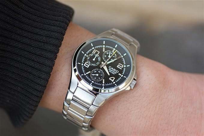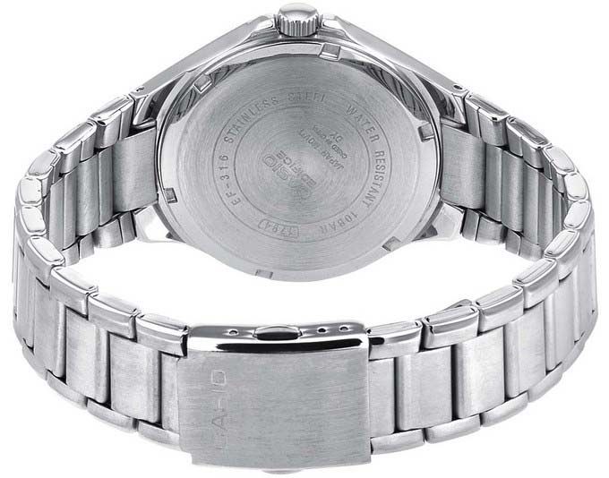 Мужские кварцевые аналоговые наручные часы. Серия Edifice. Центральные часовая, минутная и секундная стрелки. Чёрный циферблат с часовыми метками в виде штрихов и четырёх арабских цифр. Стрелки и метки с люминесцентным покрытием, которое светится в темноте после непродолжительного воздействия света. 12-ти и 24-х часовой формат времени, число и день недели вынесены на отдельные малые циферблаты. Устойчивое к мелким механическим повреждениям минеральное. Круглый стальной корпус размером 40,5 мм на 48 мм, толщиной 9 мм. Переводная головка с защитой. Задняя крышка с винтовым фиксатором. Батарея рассчитана на 2 года. Стальной браслет с тройной раскладывающейся застежкой. Водонепроницаемость 100WR (подходят для плавания с маской, трубкой и обычного плавания). Вес около 108 г.