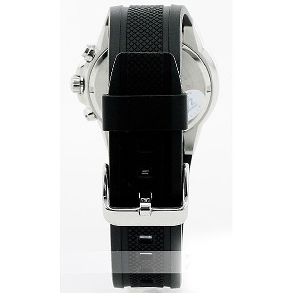 Мужские кварцевые аналоговые часы-хронограф с секундомером. Серия Edifice. Центральные часовая, минутная и секундная стрелки. Чёрный циферблат с часовыми метками в виде штрихов. Стрелки с люминесцентным покрытием, которое светится в темноте после непродолжительного воздействия света. Секундомер с точностью измерения 1 секунда и временем измерения 30 минут. 12-ти и 24-х часовой формат отображения времени на дополнительном малом циферблате в позиции 3 ч. Устойчивое к мелким механическим повреждениям минеральное стекло. Круглый стальной корпус с чёрным PVD покрытием на безеле. Минутная шкала на безеле. Размеры корпуса 49,1 мм на 43,8 мм, толщина 10,8мм. Рифлёная переводная головка с защитой. Задняя крышка с винтовым фиксатором. Чёрный пластиковый ремешок с классической застёжкой buckle. Батарея рассчитана на 2 года. Водозащищённость 100WR (часы подходят для плавания с маской и трубкой и обычного плавания). Вес около 81 г.