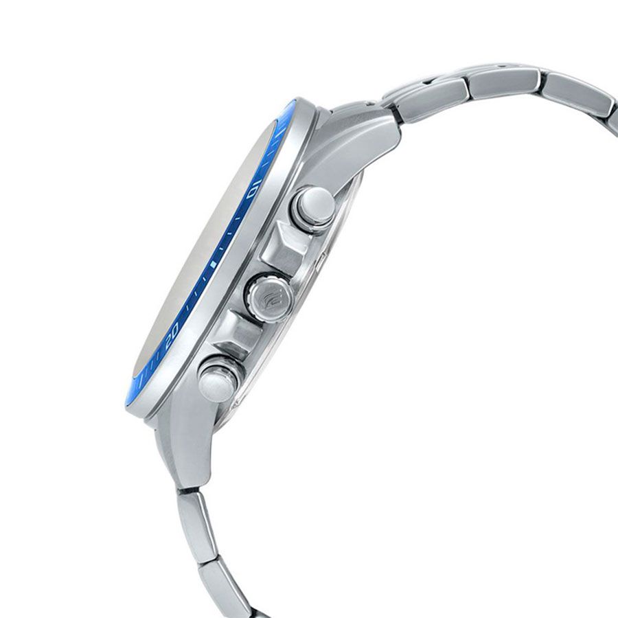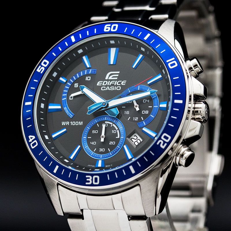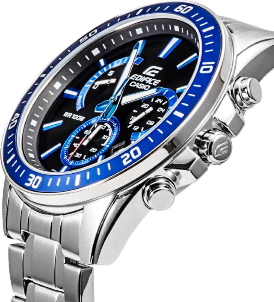 Мужские кварцевые аналоговые наручные часы-хронограф с секундомером. Серия Edifice. Центральные часовая, минутная и секундная стрелки. Чёрный циферблат с часовыми метками в виде штрихов. Стрелки и часовые метки с люминесцентным покрытием, которое светится в темноте после непродолжительного воздействия света. Индикация даты в позиции между 4 и 5 часами. Секундомер с точностью показаний 1 секунда и временем измерения 10 минут. Режимы измерения: прошедшее время, промежуточное время, два финишных результата. Стрелочный указатель времени суток с 24-х часовой шкалой на дополнительном малом циферблате в позиции 3 часов. Ретроградный (стрелочный указатель, движущийся на секторной части циферблата, и скачком возвращающийся обратно) указатель минутной стрелки хронографа в позиции 10 часов. Устойчивое к мелким механическим повреждениям минеральное стекло. Круглый стальной корпус синим IP покрытием на безеле. Минутная шкала на безеле. Размеры корпуса 53 мм на 47мм, толщина 12,3мм. Рифлёная переводная головка с защитой. Задняя крышка с винтовым фиксатором. Стальной браслет с тройной раскладывающейся застёжкой. Батарея рассчитана на 3 года. Водонепроницаемость 100WR (часы подходят для плавания с маской, трубкой, обычного плавания). Вес около 157 г.