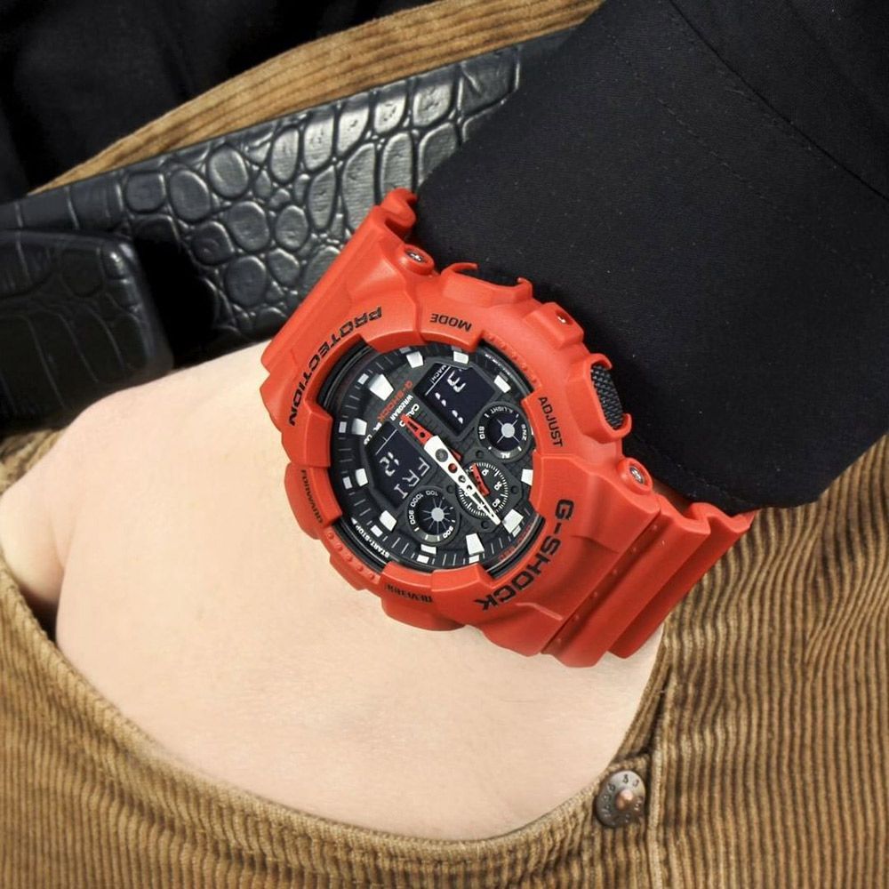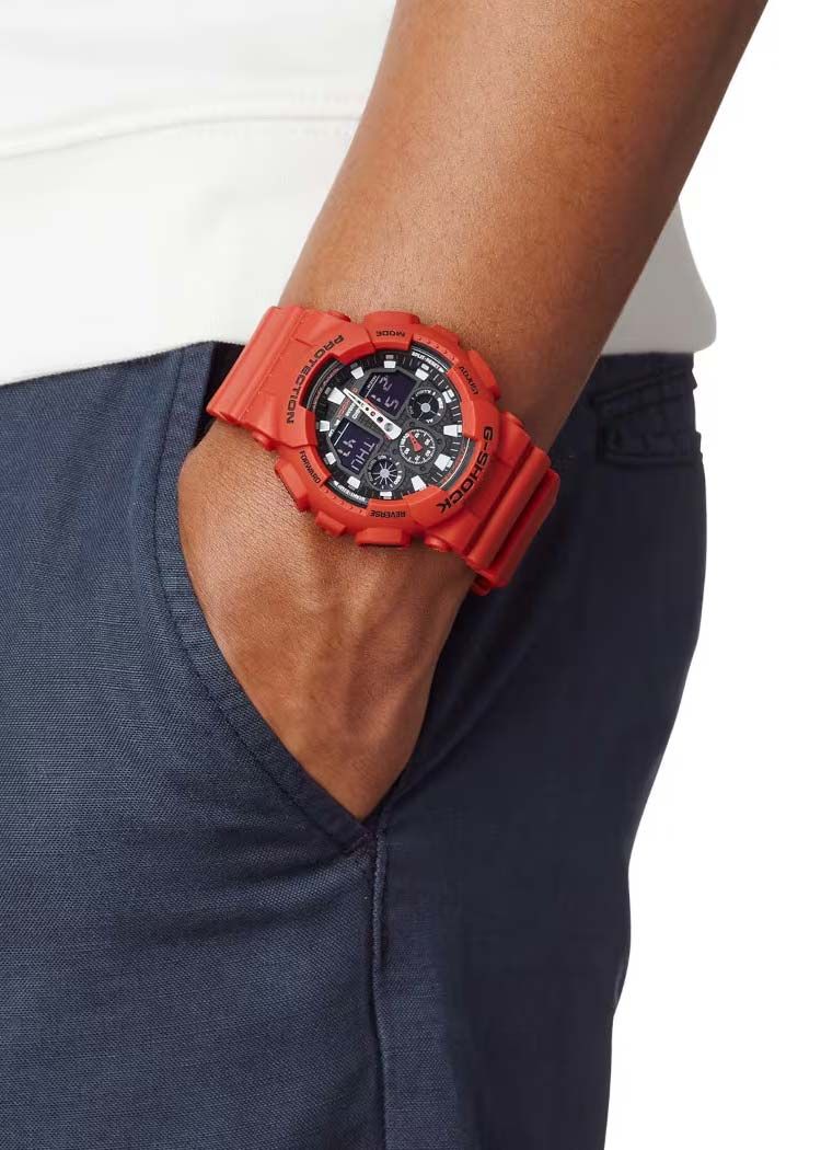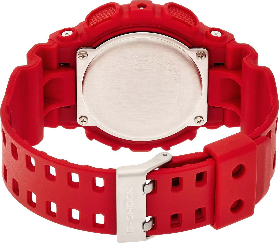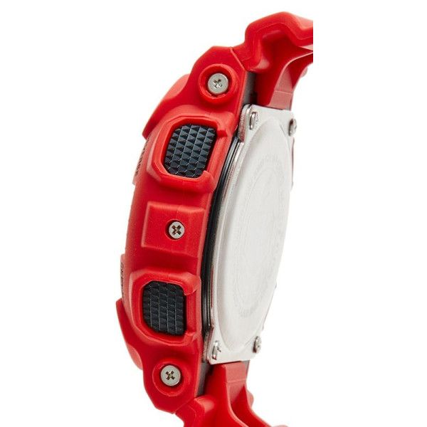 Мужские кварцевые наручные часы c аналого-цифровым отображением времени. Серия Casio G-Shock. Противоударный корпус защищает механизм часов от ударов и вибрации. Часы созданы с защитой от воздействия магнитных полей. Автоматическая светодиодная подсветка — при недостаточном освещении поворот руки включает подсветку циферблата, выбор продолжительности подсветки 1,5 или 3 секунды, послесвечение. Мировое время – 48 городов (29 часовых поясов), всемирное координированное время (UTC). Автоматический переход на зимнее и летнее время, возможность включения/отключения данной функции. 12-ти и 24-х часовой формат отображения времени. Секундомер с точностью показаний 1/1000 секунды и временем измерения 100 часов. Режимы измерения: пройденное время, время круга, промежуточное время. Расчет скорости по выбранной дистанции. Таймер обратного отсчета от 1 минуты до 24 часов (с интервалом в 1 минуту и с интервалом в 1 час) с автоповтором. 5 ежедневных будильников, один с функцией повтора сигнала Snooze, ежечасный сигнал. Отображение скорости. Автоматический календарь до 2099 года. Круглый корпус из полимерного пластика красного цвета. Габаритные размеры корпуса 51,2 мм на 55мм, толщина 16,9мм. Чёрный циферблат с белыми и красными стрелками и с часовыми индексами в виде штрихов. Устойчивое к мелким механическим повреждениям минеральное стекло. Красный пластиковый ремешок с классической застежкой buckle. Батарея рассчитана на 2 года. Водонепроницаемость 200WR (часы подходят для плавания с маской, трубкой, обычного плавания). Вес около 70 г.