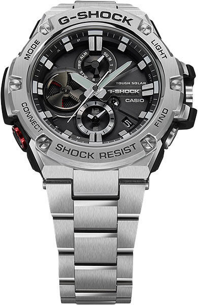 защищает механизм от ударов и вибрации. Циферблат подсвечивается ярким светодиодом. Светонакопительное покрытие необрит продолжает светиться в темноте даже после непродолжительного пребывания на свету. Беспроводная технология Bluetooth® 4.0 со сверхнизким потреблением энергии для синхронизации со смартфоном. Автоматическое подключение к серверу времени через смартфон для корректировки текущего и настроек мирового времени (до 300 городов). Настройка времени будильника на телефоне. Функция поиска телефона. Второй часовой пояс.Второй часовой пояс