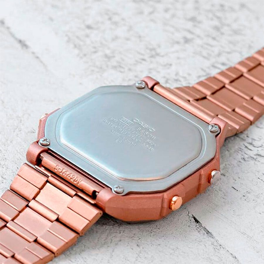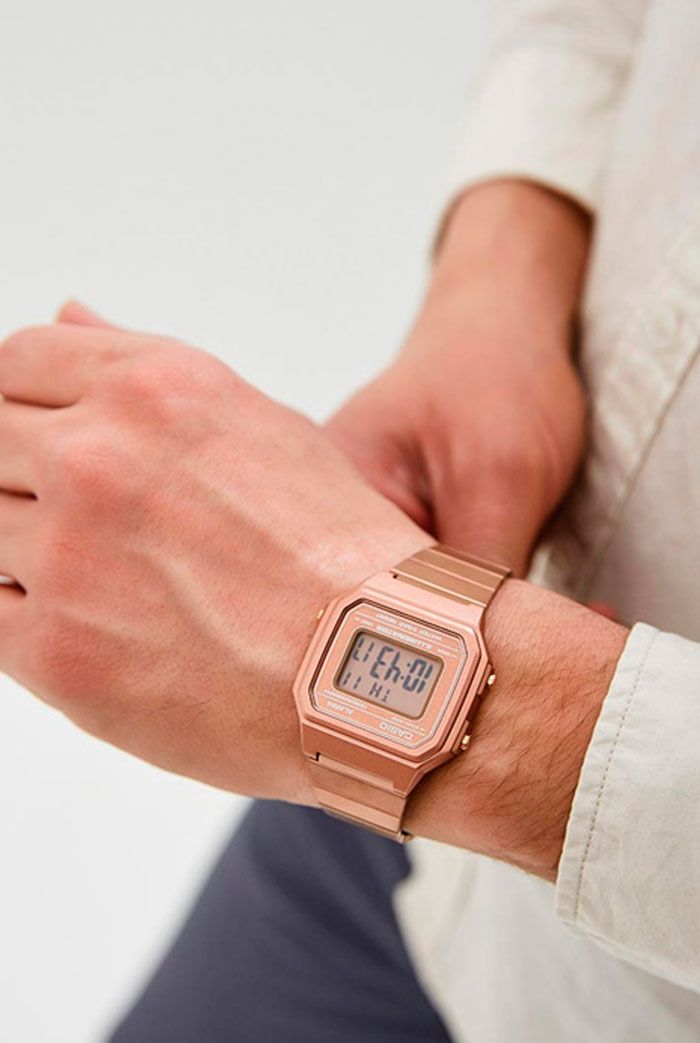 Мужские кварцевые электронные наручные часы на каждый день в популярном ретро-стиле. EDGY. Серия Casio Vintage. Циферблат подсвечивается светодиодом. 12-ти и 24-х часовой формат отображения времени. Секундомер с точностью показаний 1/100 с и временем измерения 1ч. Режимы измерения: прошедшее время, промежуточное время, два финишных результата. Ежедневный будильник, сигнал начала часа. Автоматический календарь, учитывающий 28 дней в феврале. Прямоугольный корпус из полимерного пластика золотистого цвета. Размер корпуса 43,1 мм на 41,2 мм, толщина 10,5 мм. Пластиковое стекло. Стальной браслет с IP покрытием цвета розового золота, регулируемая застежка. Батарея рассчитана на 7 лет. Водонепроницаемость 50WR (мытьё рук, дождь). Вес около 63 г.