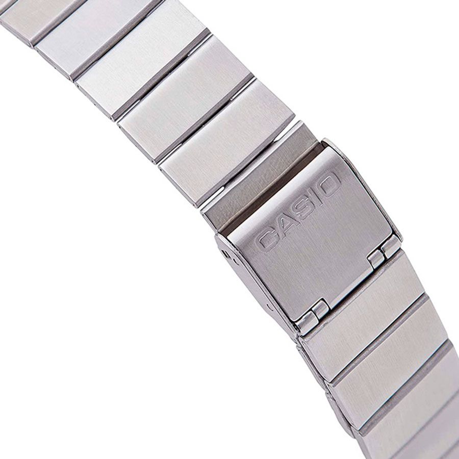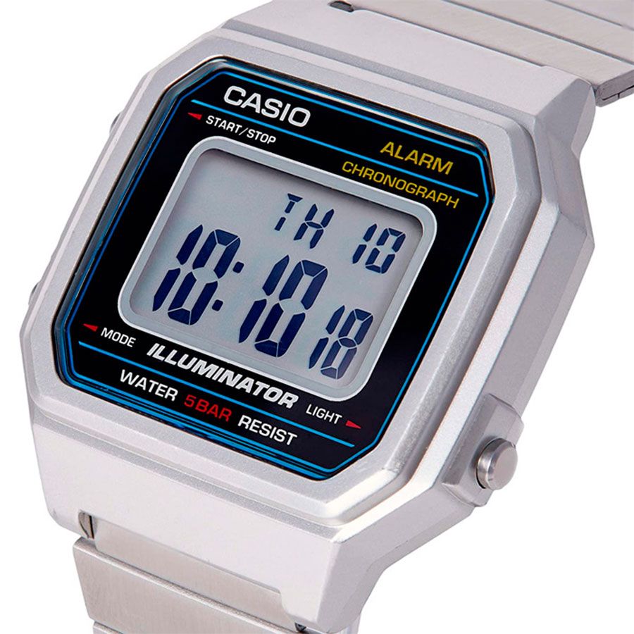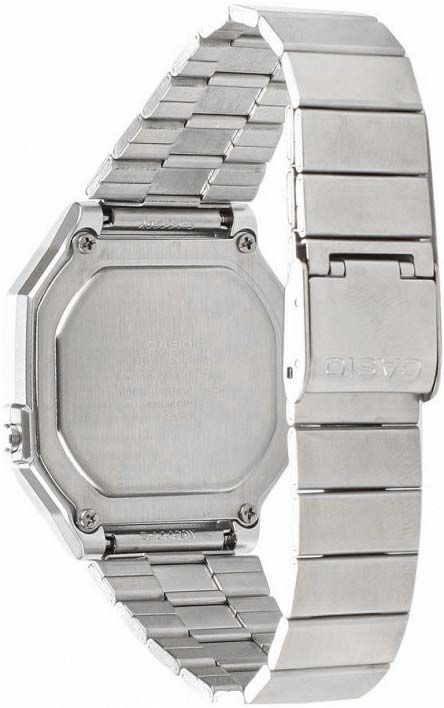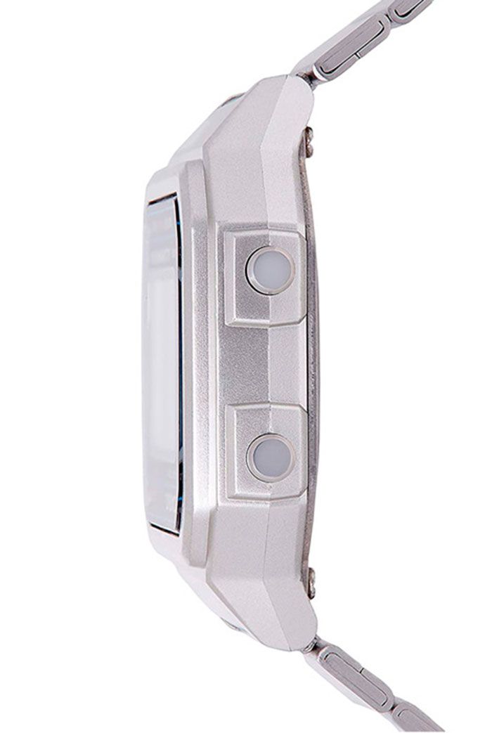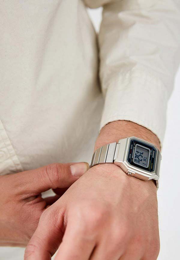 Мужские кварцевые электронные наручные часы на каждый день в популярном ретро-стиле. EDGY. Серия Casio Vintage. Циферблат подсвечивается светодиодом. 12-ти и 24-х часовой формат отображения времени. Секундомер с точностью показаний 1/100 с и временем измерения 1ч. Режимы измерения: прошедшее время, промежуточное время, два финишных результата. Ежедневный будильник, сигнал начала часа. Автоматический календарь, учитывающий 28 дней в феврале. Прямоугольный корпус из полимерного пластика серебристого цвета. Размер корпуса 43,1 мм на 41,2 мм, толщина 10,5 мм. Пластиковое стекло. Стальной браслет с регулируемой застежкой. Батарея рассчитана на 7 лет. Водонепроницаемость 50WR (мытьё рук, дождь). Вес около 63 г.