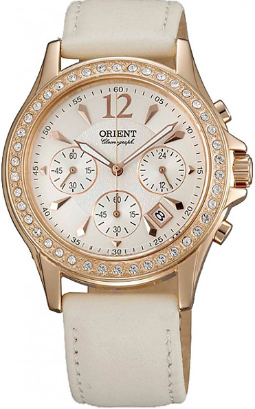 Часы-хронограф с секундомером. 12-ти и 24-х часовой формат времени. Корпус часов украшен кристаллами. Функции: Секундомер. Число.
