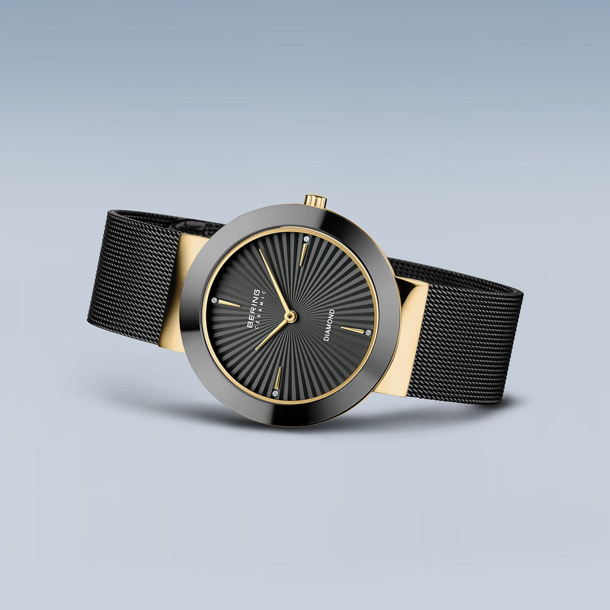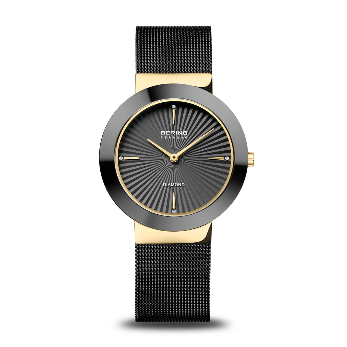 Женские кварцевые наручные часы с аналоговым отображением времени (стрелочные). Серия Ceramic Diamond Сollection. Роскошные часы сочетают минималистичный дизайн с изысканным сочетанием материалов. Гармоничное сочетание керамики, нержавеющей стали и кристаллов – создано для женщин, ценящих вневременную красоту и роскошные детали. Механизм MIYOTA 9T22. Центральные часовая и минутная стрелки золотистого цвета. Чёрный циферблат с гильошированием в виде солнечных лучей и с часовыми метками в виде четырёх золотистых штрихов и кристаллов. Круглый стальной полированный корпус с IP покрытием цвета жёлтого золота с чёрным керамическим безелем. Диаметр корпуса 35 мм, толщина 6 мм. Устойчивое к возникновению мелких царапин плоское сапфировое стекло. Стальной браслет миланского плетения с чёрным IP покрытием. Ширина браслета 18 мм, раскладывающаяся застёжка с предохранительной защёлкой. Водонепроницаемость WR50 (мытьё рук, дождь).