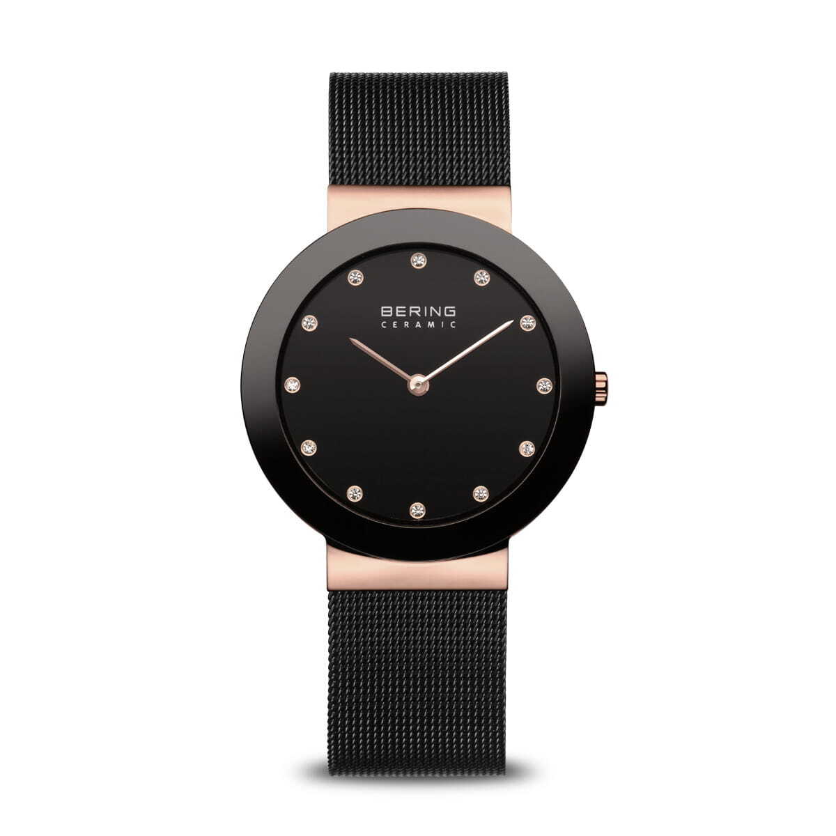 Женские кварцевые наручные часы с аналоговым отображением времени. Серия Bering Ceramic. Механизм MIYOTA 9T22. Центральные часовая и минутная стрелки золотистого цвета. Чёрный циферблат с часовыми метками в виде кристаллов. Круглый стальной полированный корпус с IP покрытием цвета розового золота. Чёрный керамический безель. Диаметр корпуса 35 мм, толщина 6 мм. Устойчивое к возникновению мелких царапин плоское сапфировое стекло. Стальной браслет миланского плетения с чёрным IP покрытием. Ширина браслета 18 мм, длина браслета 180 мм. Регулируемая по длине застежка с предохранительной защелкой. Водонепроницаемость WR50 (мытьё рук, дождь).