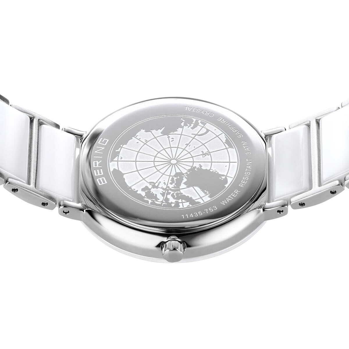 Женские кварцевые наручные часы с аналоговым отображением времени. Серия Ceramic Сollection. Механизм MIYOTA 9T22. Центральные часовая и минутная стрелки. Белый циферблат с гильошированием в виде солнечных лучей и с часовыми метками в виде штрихов и кристаллов. Круглый стальной корпус с белым керамическим безелем. Диаметр корпуса 35 мм, толщина 6 мм. Устойчивое к возникновению мелких царапин плоское сапфировое стекло. Стальной браслет с керамическими вставками белого цвета. Ширина браслета 18 мм, застёжка бабочка. Водонепроницаемость WR30 (защита от брызг).