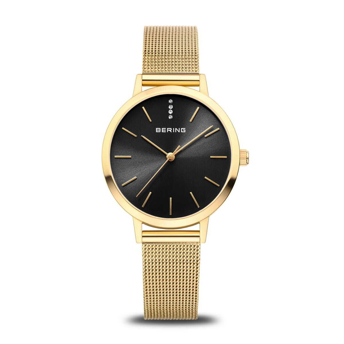 Женские кварцевые наручные часы с аналоговым отображением времени. Серия Classic Collection. Эти женские часы сочетают в себе скандинавскую чистоту и нотку гламура. Центральные часовая, минутная и секундная стрелки золотистого цвета. Чёрный циферблат с часовыми метками в виде золотистых штрихов. Четыре изящно закрепленных кристалла в положении «12 часов» создают элегантный акцент, не нарушая гармонии минималистичного дизайна. Круглый стальной полированный корпус с IP покрытием цвета жёлтого золота. Диаметр корпуса 34 мм, толщина 7 мм. Устойчивое к возникновению мелких царапин плоское сапфировое стекло. Стальной браслет миланского плетения с IP покрытием цвета жёлтого золота. Ширина браслета 14 мм, длина браслета 175 мм. Водонепроницаемость WR30 (защита от брызг).