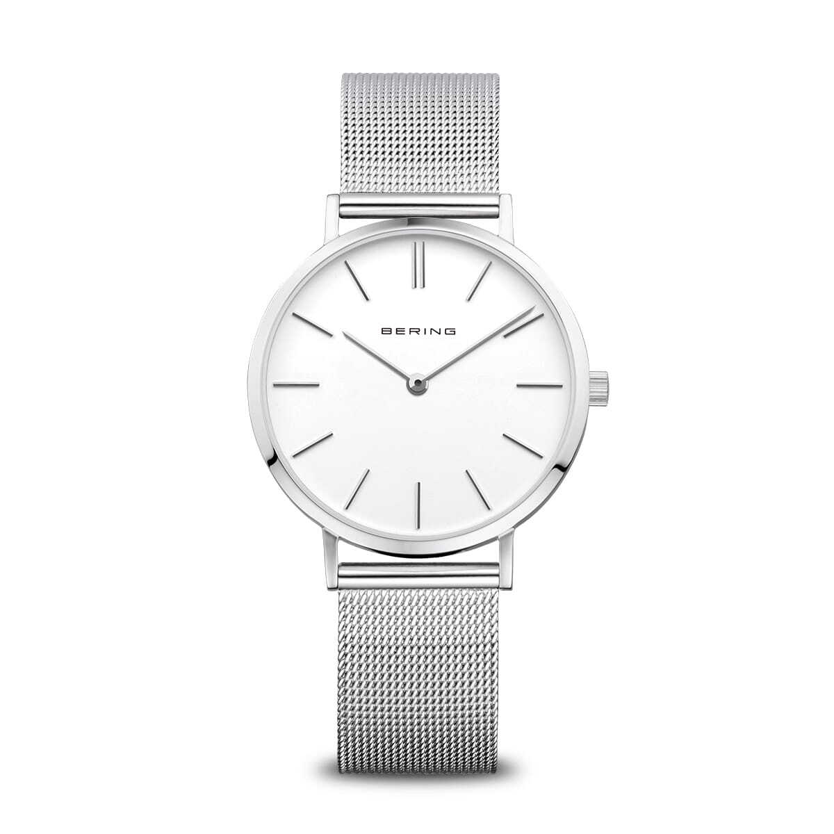 Женские кварцевые наручные часы с аналоговым отображением времени. Серия Classic Collection. Механизм Miyota 9T22. Центральные часовая и минутная стрелки серебристого цвета. Белый циферблат с часовыми метками в виде серебристых штрихов. Круглый стальной полированный корпус диаметром 34 мм, толщиной 6 мм. Устойчивое к возникновению мелких царапин плоское сапфировое стекло. Стальной браслет миланского плетения. Ширина браслета 16 мм, длина браслета 185 мм. Регулируемая по длине застежка с предохранительной защелкой. Водонепроницаемость WR30 (защита от брызг).