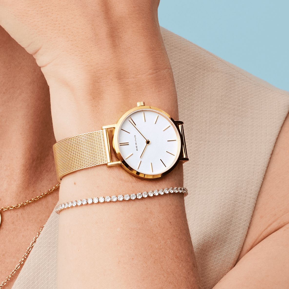 Женские кварцевые наручные часы с аналоговым отображением времени. Серия Classic Collection. Механизм Miyota 9T22. Центральные часовая и минутная стрелки золотистого цвета. Белый циферблат с часовыми метками в виде золотистых штрихов. Круглый стальной полированный корпус с IP покрытием цвета жёлтого золота. Диаметр корпуса 34 мм, толщина 6 мм. Устойчивое к возникновению мелких царапин плоское сапфировое стекло. Стальной браслет миланского плетения с IP покрытием цвета жёлтого золота. Ширина браслета 16 мм, длина браслета 185 мм. Регулируемая по длине застежка с предохранительной защелкой. Водонепроницаемость WR30 (защита от брызг).