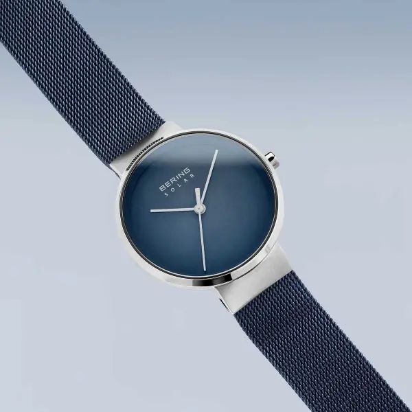 Женские кварцевые аналоговые наручные часы на солнечной батарее. Серия Solar Collection. Механизм EPSON AS01AM. Центральные часовая, минутная и секундная стрелки. На синем циферблате намеренно отсутствуют индексы, что полностью соответствует минималистичному скандинавскому дизайну. Питание от солнечной энергии - источником питания служит светочувствительная панель и аккумулятор, заряжаемый при попадании солнечного света на циферблат часов. Механизм на солнечной батарее сохраняет энергию в течение нескольких месяцев, избавляя от необходимости замены батарейки. Запас хода после полной зарядки от 6 до 12 месяцев. Круглый стальной полированный корпус диаметром 31 мм, толщиной 9 мм. Устойчивое к возникновению мелких царапин плоское сапфировое стекло. Стальной браслет миланского плетения с синим IP покрытием. Раскладывающаяся застёжка с предохранительной защёлкой. Ширина браслета 14 мм, длина браслета 180 мм. Водонепроницаемость WR50 (мытьё рук, дождь).