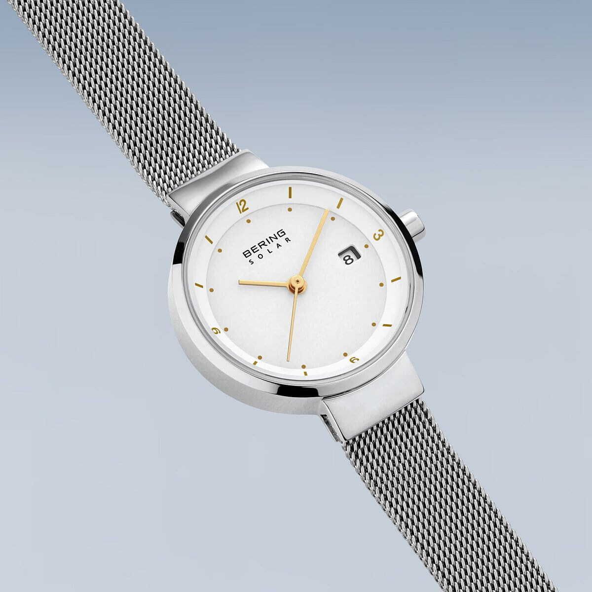 Женские кварцевые аналоговые наручные часы на солнечной батарее. Серия Slim Solar. Классический скандинавский стиль - идеальное сочетание элегантности, минимализма и экологичности. Легкие и ультратонкие часы. Питание от солнечной энергии (не требует замены батарейки) - источником питания служит светочувствительная панель и аккумулятор, заряжаемый при попадании солнечного света на циферблат часов. Запас хода при полностью заряженной батарее от 6 до 12 месяцев. Центральные часовая, минутная и секундная стрелки золотистого цвета. Белый циферблат с часовыми метками в виде золотистых штрихов и четырёх арабских цифр (12, 3, 6 и 9). Индикация даты в позиции 3 часов. Круглый стальной корпус диаметром 26 мм, толщиной 7 мм. Устойчивое к возникновению мелких царапин плоское сапфировое стекло. Стальной браслет миланского плетения. Ширина браслета 10 мм, длина браслета 190 мм. Водонепроницаемость WR50 (мытьё рук, дождь).