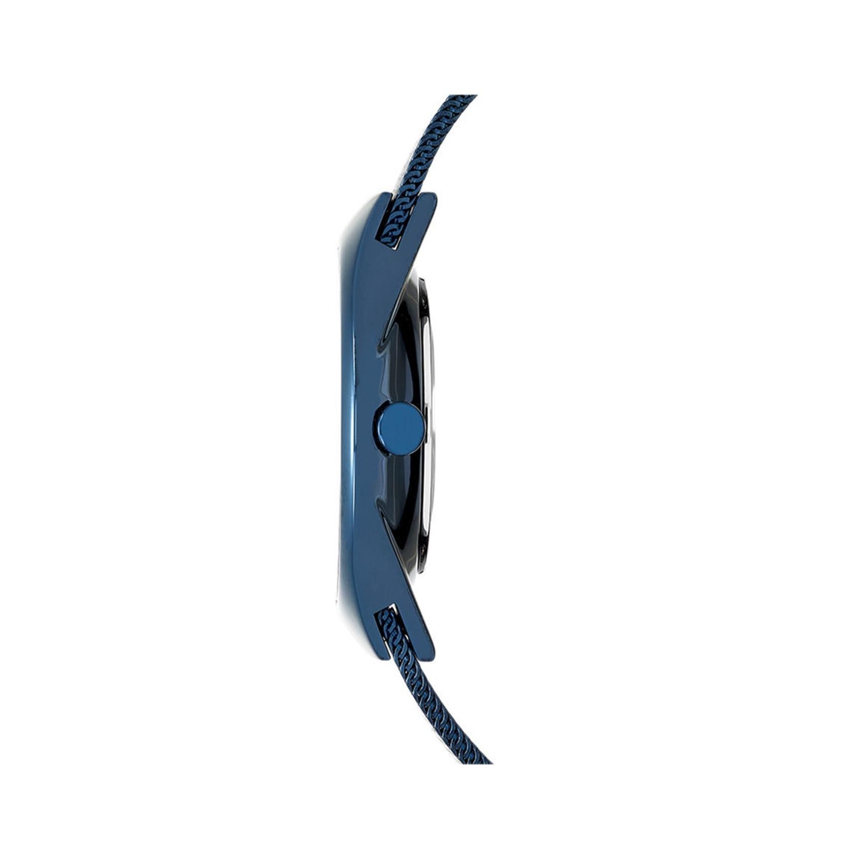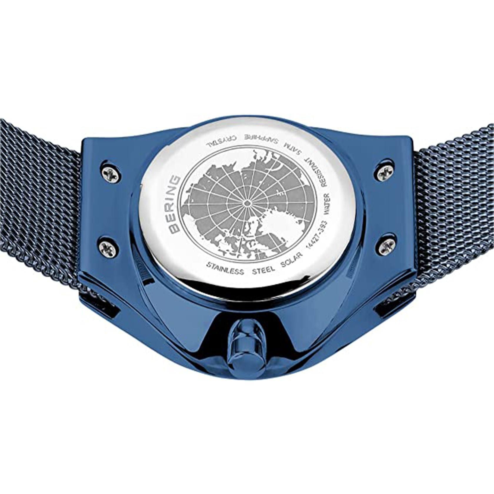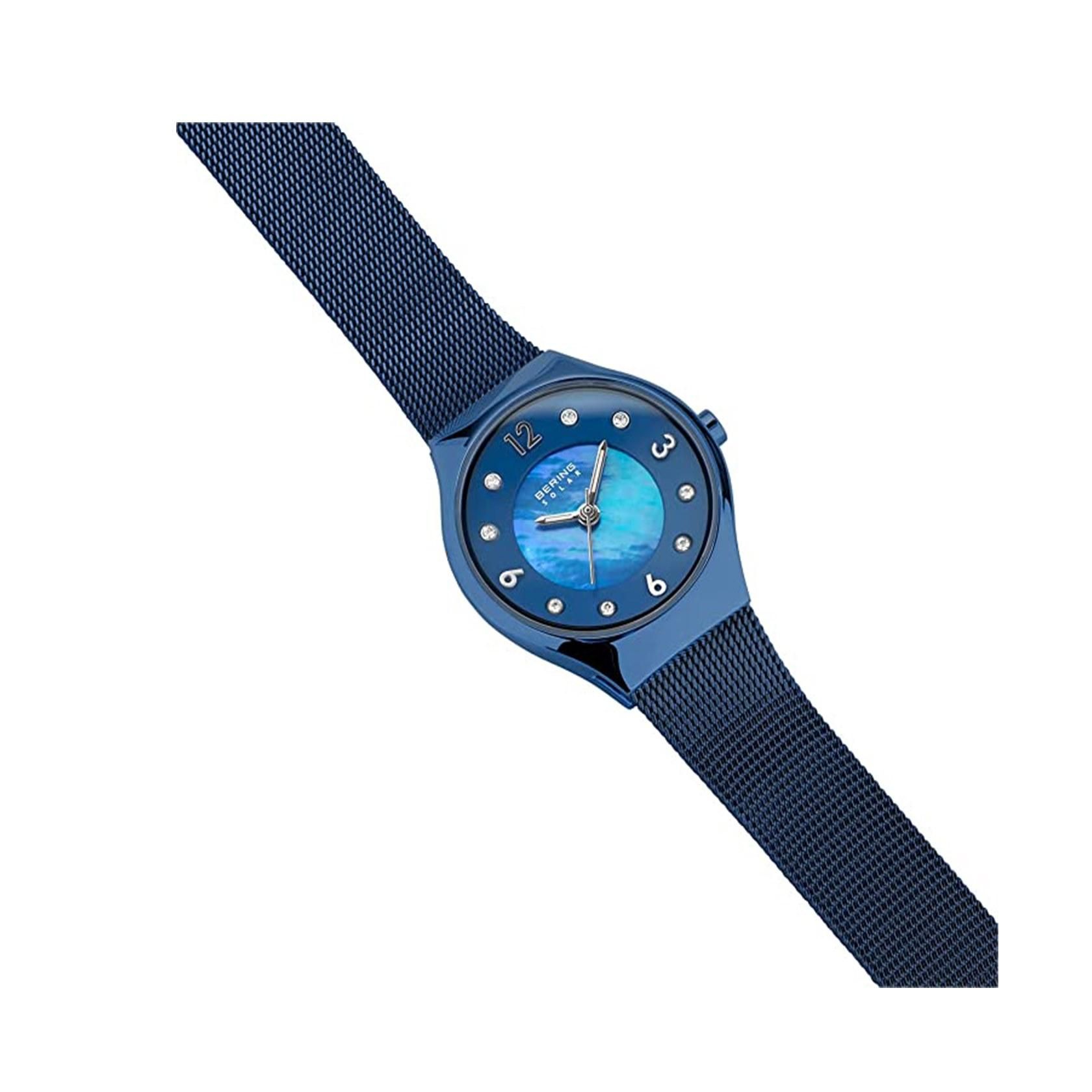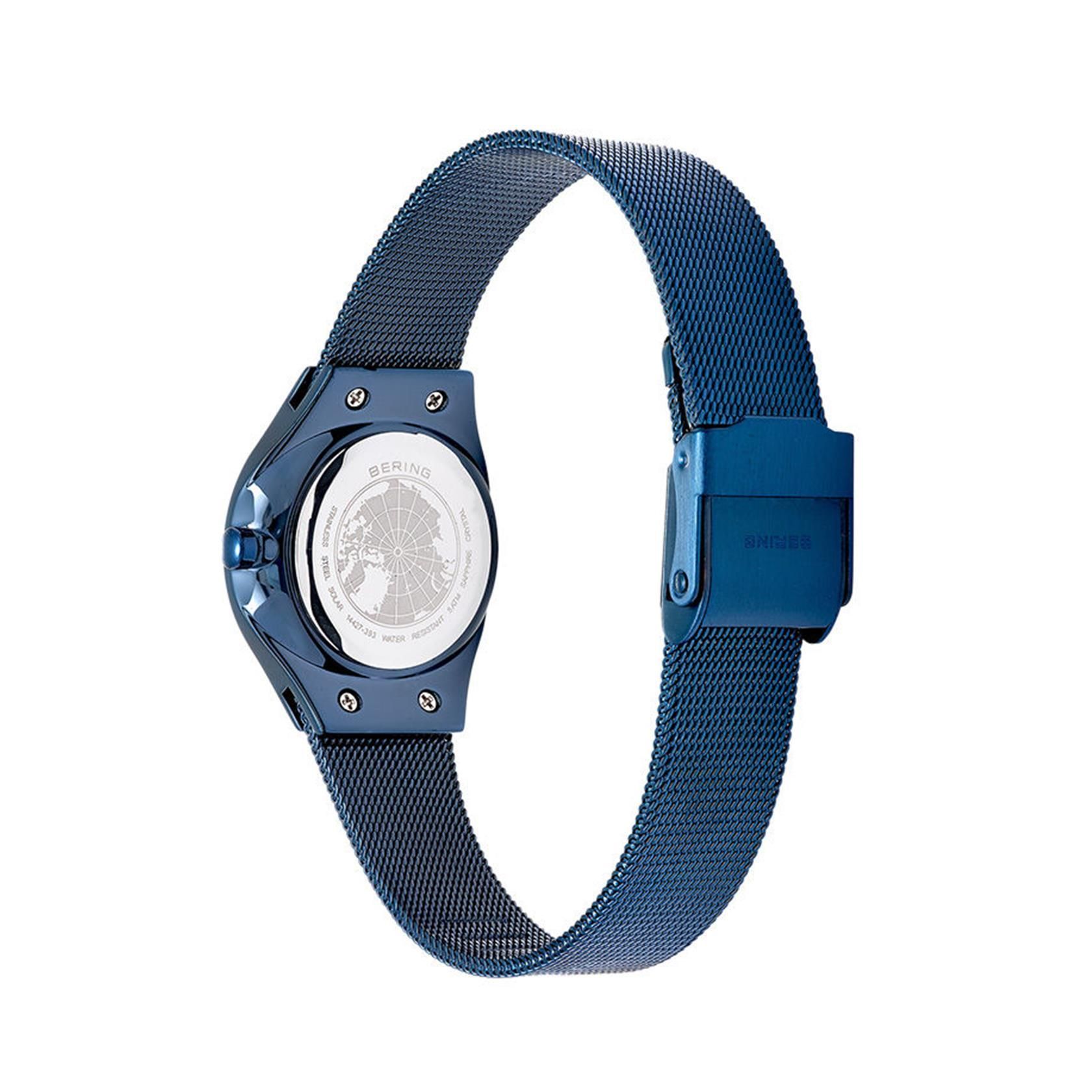 Женские кварцевые аналоговые наручные часы на солнечной батарее. Коллекция Slim Solar. Центральные часовая, минутная и секундная стрелки. Синий перламутровый циферблат с часовыми метками в виде кристаллов и четырёх арабских цифр (12, 6, 3 и 9). Стрелки с люминесцентным покрытием, которое светится в темноте после непродолжительного воздействия света. Питание от солнечной энергии - источником питания служит светочувствительная панель и аккумулятор, заряжаемый при попадании солнечного света на циферблат часов. Механизм на солнечной батарее сохраняет энергию в течение нескольких месяцев, избавляя от необходимости замены батарейки. Запас хода после полной зарядки от 6 до 12 месяцев. Круглый стальной корпус с IP покрытием синего цвета. Диаметр корпуса 27 мм, толщина 7 мм. Устойчивое к возникновению мелких царапин плоское сапфировое стекло. Стальной браслет миланского плетения с IP покрытием синего цвета. Ширина браслета 15 мм, длина браслета 167 мм. Водонепроницаемость WR50 (мытьё рук, дождь).