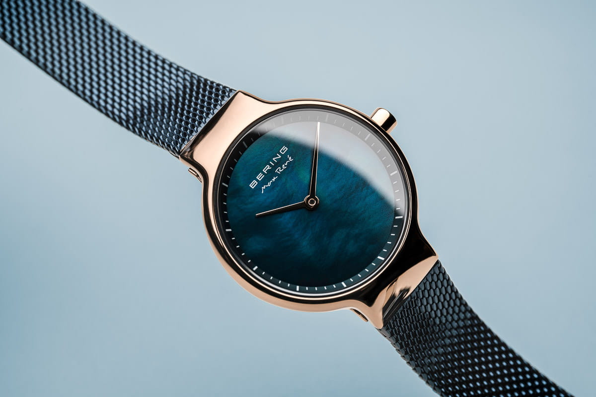 Женские кварцевые наручные часы с аналоговым отображением времени. Slim Design из коллекции Max René. Коллекция создана ведущим датским дизайнером Максом Рене. Механизм Miyota GL22. Центральные часовая и минутная стрелки золотистого цвета. Перламутровый cbybq циферблат с автографом Макса Рене и часовыми метками в виде штрихов. Круглый стальной полированный корпус с IP покрытием цвета розового золота. Диаметр корпуса 27 мм, толщина 7 мм. Устойчивое к возникновению мелких царапин плоское сапфировое стекло. Стальной браслет миланского плетения с синим IP покрытием. Ширина браслета 12 мм, длина браслета 170 мм. Стальная задняя крышка с автографом Макса Рене. Инициалы Макса Рене также выгравированы на переводной головке. Водонепроницаемость WR50 (мытьё рук, дождь).