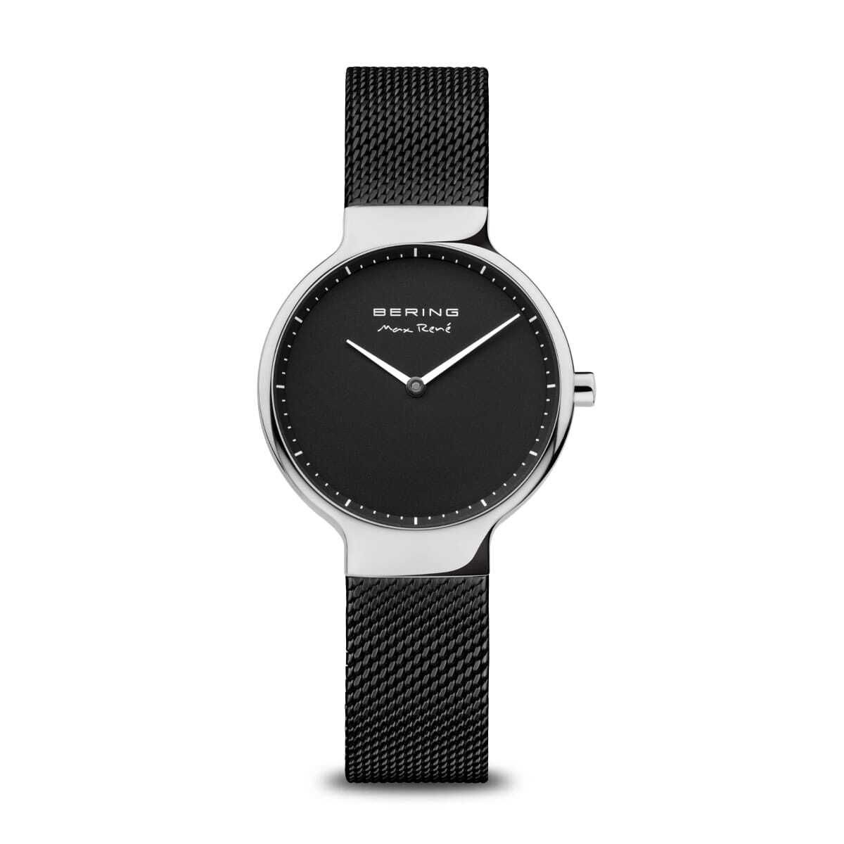 Женские кварцевые наручные часы c аналоговым отображением времени. Коллекция создана ведущим датским дизайнером Максом Рене. Механизм Miyota GL22. Центральные часовая и минутная стрелки. Чёрный циферблат с автографом Макса Рене и часовыми метками в виде штрихов. Круглый стальной полированный корпус. Диаметр корпуса 31 мм, толщина 7 мм. Устойчивое к возникновению мелких царапин плоское сапфировое стекло. Стальной браслет миланского плетения с чёрным IP покрытием. Ширина браслета 14 мм. Водонепроницаемость WR50 (мытьё рук, дождь).