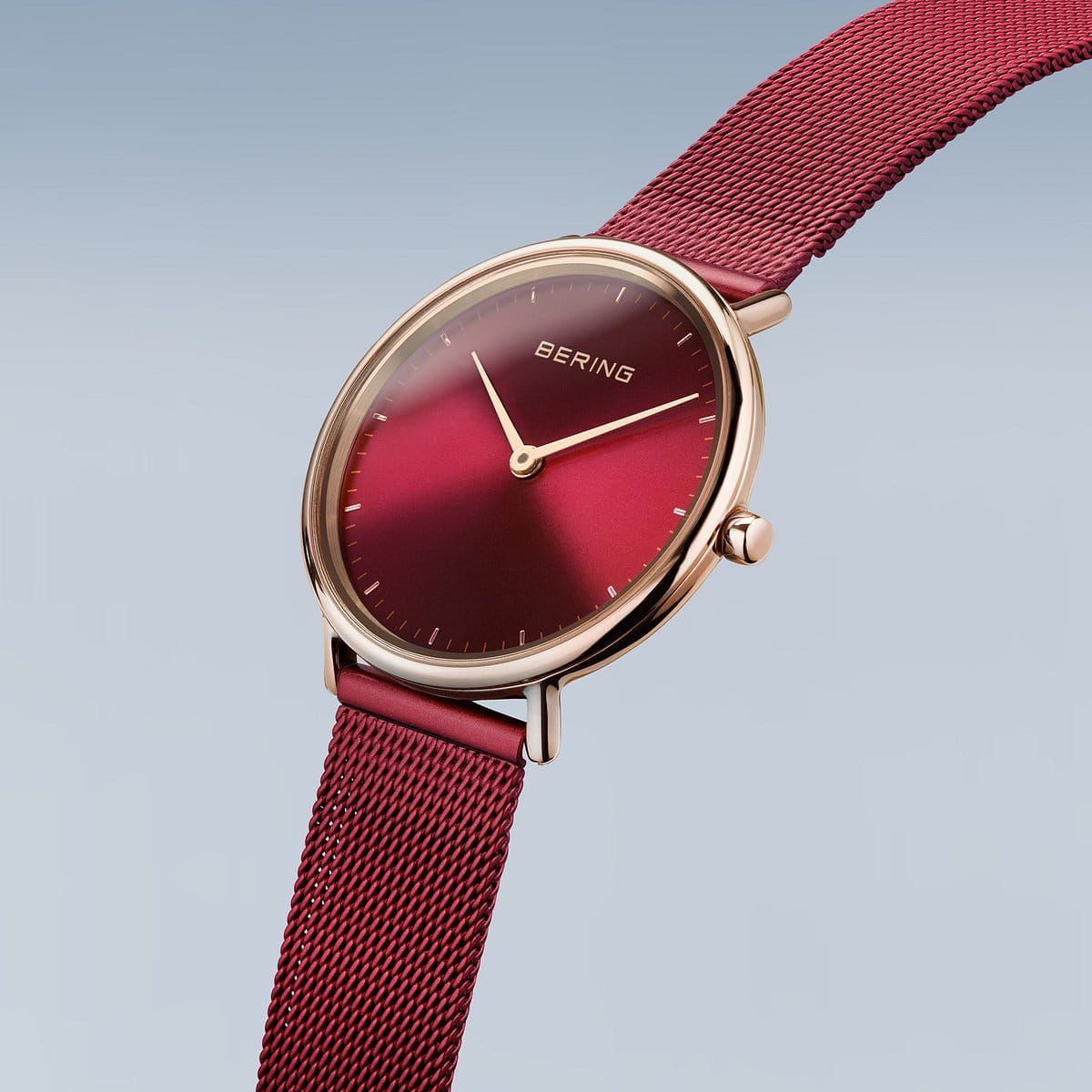 Женские кварцевые наручные часы с аналоговым отображением времени. Серия Classic Сollection Ultra Slim 5.5. Механизм Miyota 9T22. Центральные часовая и минутная стрелки золотистого цвета. Красный циферблат с часовыми метками в виде штрихов. Ультратонкий круглый стальной полированный корпус с IP покрытием цвета розового золота. Диаметр корпуса 29 мм, толщина 5 мм. Устойчивое к возникновению мелких царапин плоское сапфировое стекло. Стальной браслет миланского плетения с красным IP покрытием. Ширина браслета 14 мм, длина браслета 182 мм. Водонепроницаемость WR30 (защита от брызг).