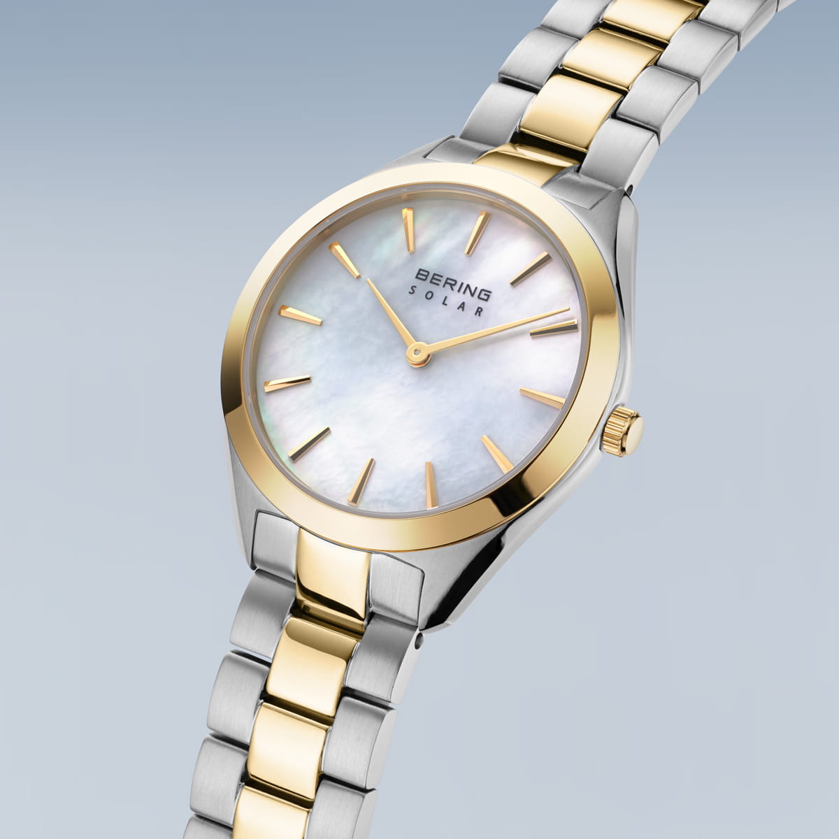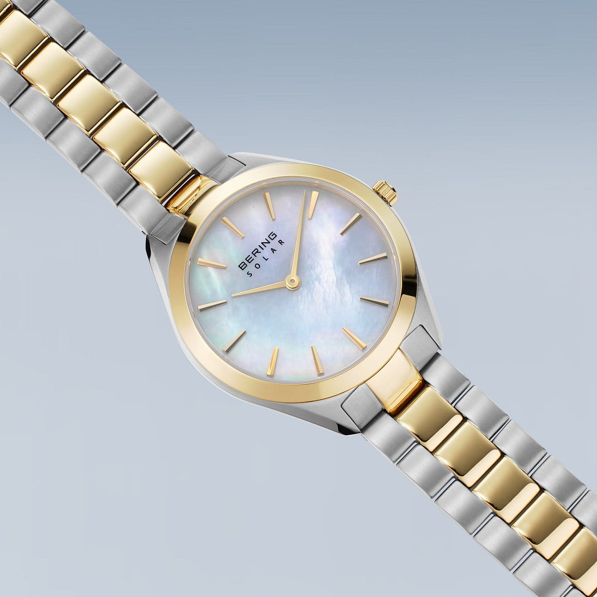 Женские кварцевые аналоговые наручные часы на солнечной батарее. Серия Solar Collection - вневременная элегантность. Идеальное сочетание классического стиля и экологичности. Часы не только практичный аксессуар на каждый день, но и изящный акцент, подчеркивающий Вашу индивидуальность и утонченность. Центральные часовая и минутная стрелки золотистого цвета. Голубой перламутровый циферблат с часовыми метками в виде золотистых штрихов. Питание от солнечной энергии (не требуется замены батарейки) - источником питания служит светочувствительная панель и аккумулятор, заряжаемый при попадании солнечного света на циферблат часов. Запас хода после полной зарядки от 6 до 12 месяцев. Круглый стальной полированный корпус с IP покрытием цвета жёлтого золота на безеле. Диаметр корпуса 31 мм, толщина 6 мм. Устойчивое к возникновению мелких царапин плоское сапфировое стекло. Стальной браслет с частичным IP покрытием цвета жёлтого золота. Ширина браслета 14 мм. Раскладывающаяся застежка. Водонепроницаемость WR50 (мытьё рук, дождь).
