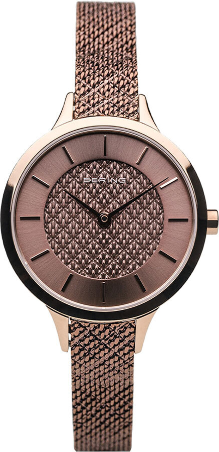 Женские кварцевые наручные часы с аналоговым отображением времени. Серия Classic Collection. Механизм Miyota GL22. Центральные часовая и минутная стрелки. Коричневый циферблат с часовыми метками в виде штрихов. Круглый стальной полированный корпус с IP покрытием цвета розового золота. Диаметр корпуса 31 мм, толщина 7 мм. Устойчивое к возникновению мелких царапин плоское сапфировое стекло. Стальной браслет миланского плетения с коричневым IP покрытием. Регулируемая застёжка с предохранительной защёлкой. Ширина браслета 10 мм, длина браслета 180 мм. Водонепроницаемость WR50 (мытьё рук, дождь).