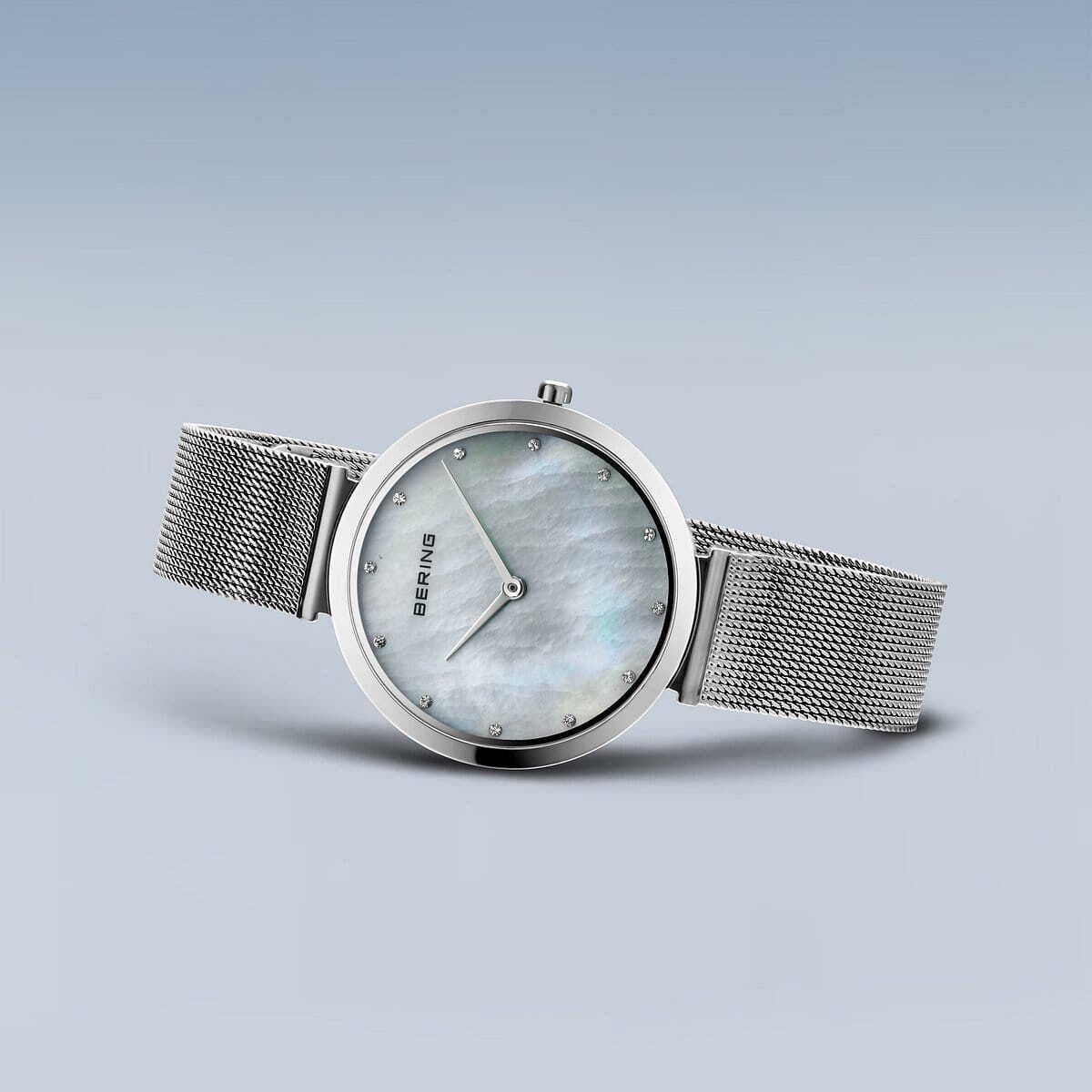 Женские кварцевые наручные часы с аналоговым отображением времени. Серия Classic Collection. Механизм MIYOTA 9T22. Центральные часовая и минутная стрелки серебристого цвета. Белый перламутровый циферблат с часовыми метками в виде кристаллов. Круглый стальной полированный корпус диаметром 32 мм, толщиной 5 мм. Устойчивое к возникновению мелких царапин плоское сапфировое стекло. Стальной браслет миланского плетения, застежка с фиксатором. Ширина браслета 14 мм, длина браслета 180 мм. Водонепроницаемость WR30 (защита от брызг).