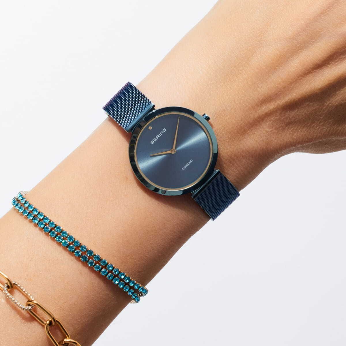 Женские кварцевые наручные часы с аналоговым отображением времени. Серия Classic Collection Diamond Charity. Часы изготовлены специально для благотворительной компании. С 2011 года Bering является партнером единственной в мире некоммерческой организации по защите белых медведей Polar Bears International (PBI). Механизм MIYOTA 9T22. Центральные часовая и минутная стрелки золотистого цвета. Голубой циферблат украшен кристаллом. Круглый стальной полированный корпус с голубым IP покрытием. Диаметр корпуса 32 мм, толщина 5 мм. Устойчивое к возникновению мелких царапин плоское сапфировое стекло. Стальной браслет миланского плетения с голубым IP покрытием. Ширина браслета 14 мм, длина браслета 180 мм. Водонепроницаемость WR30 (защита от брызг).