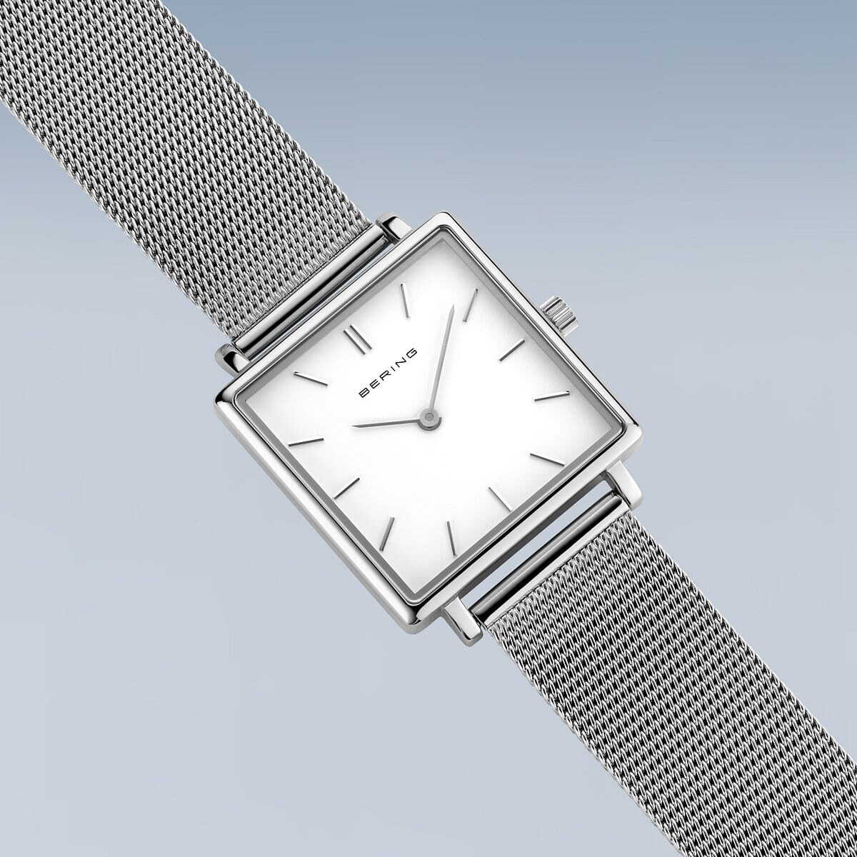 Эта женская модель из коллекции BERING Classic воплощает в себе сущность скандинавского дизайна: чистый, неподвластный времени дизайн с четкой структурой. Белый циферблат с тонкими часовыми метками и изящными стрелками словно отдает дань красоте редукции – спокойной, элегантной и точной. Прямоугольный корпус из нержавеющей стали, отделанный полированным серебром, придает часам архитектурный характер, отличая их от традиционных круглых форм. В сочетании с изящным ремешком из миланской ткани они создают гармоничный внешний вид и идеально сидят на запястье. Благодаря практичной откидной застежке часы надежны и удобны в носке. Плоское сапфировое стекло надежно защищает циферблат от царапин, а точный кварцевый механизм внутри обеспечивает точное отсчет времени.