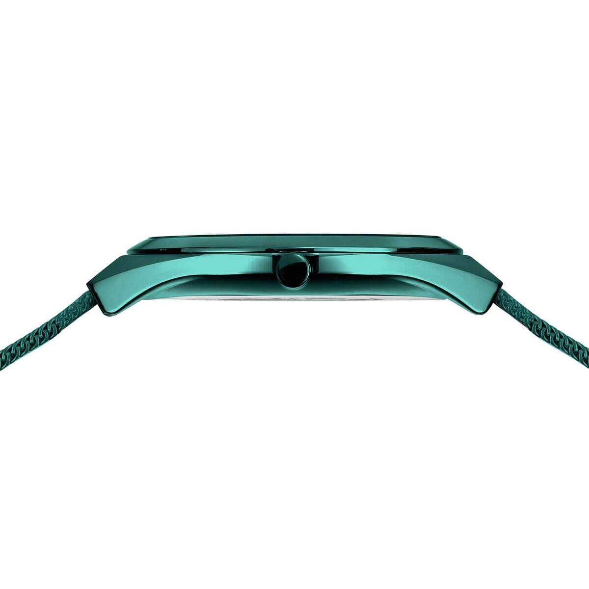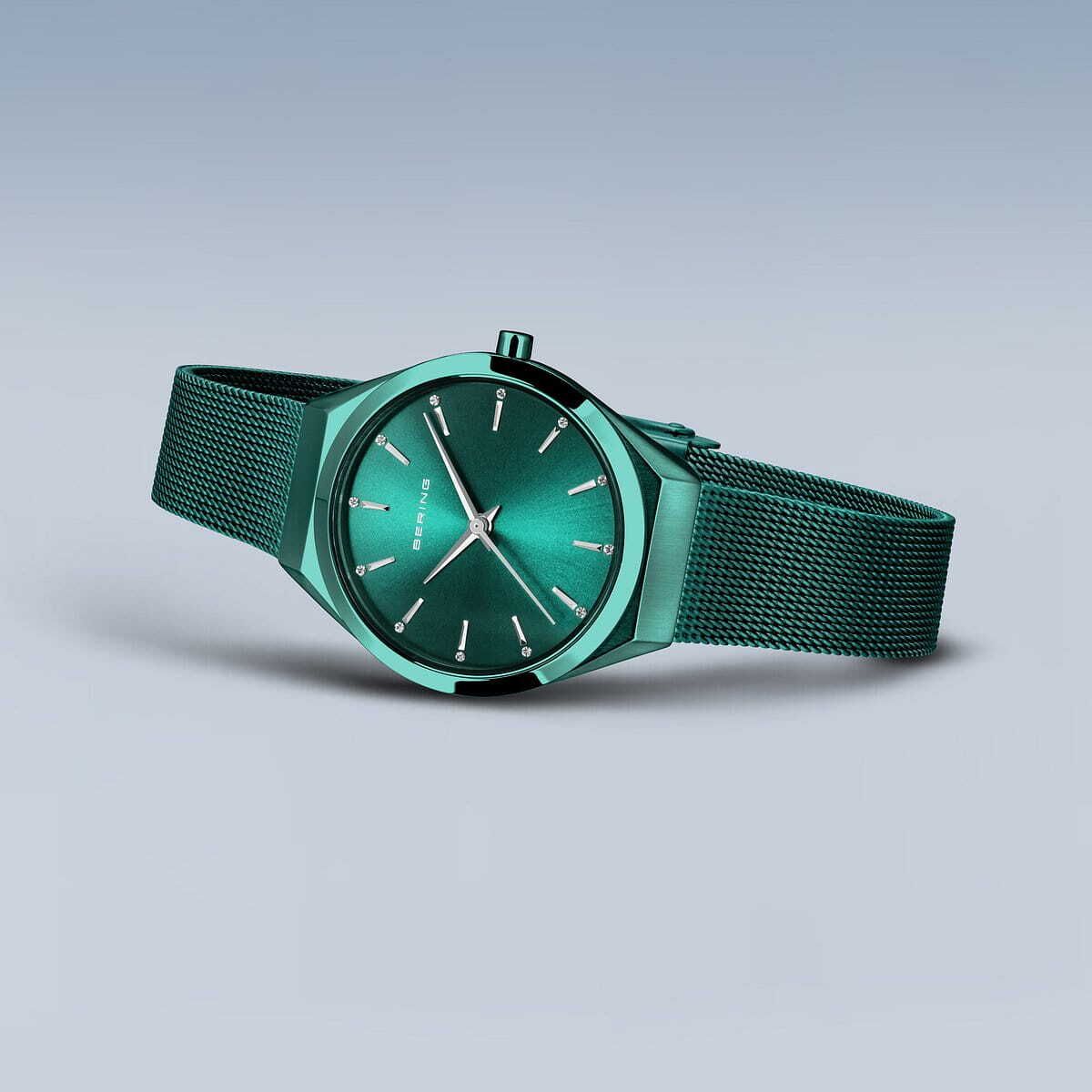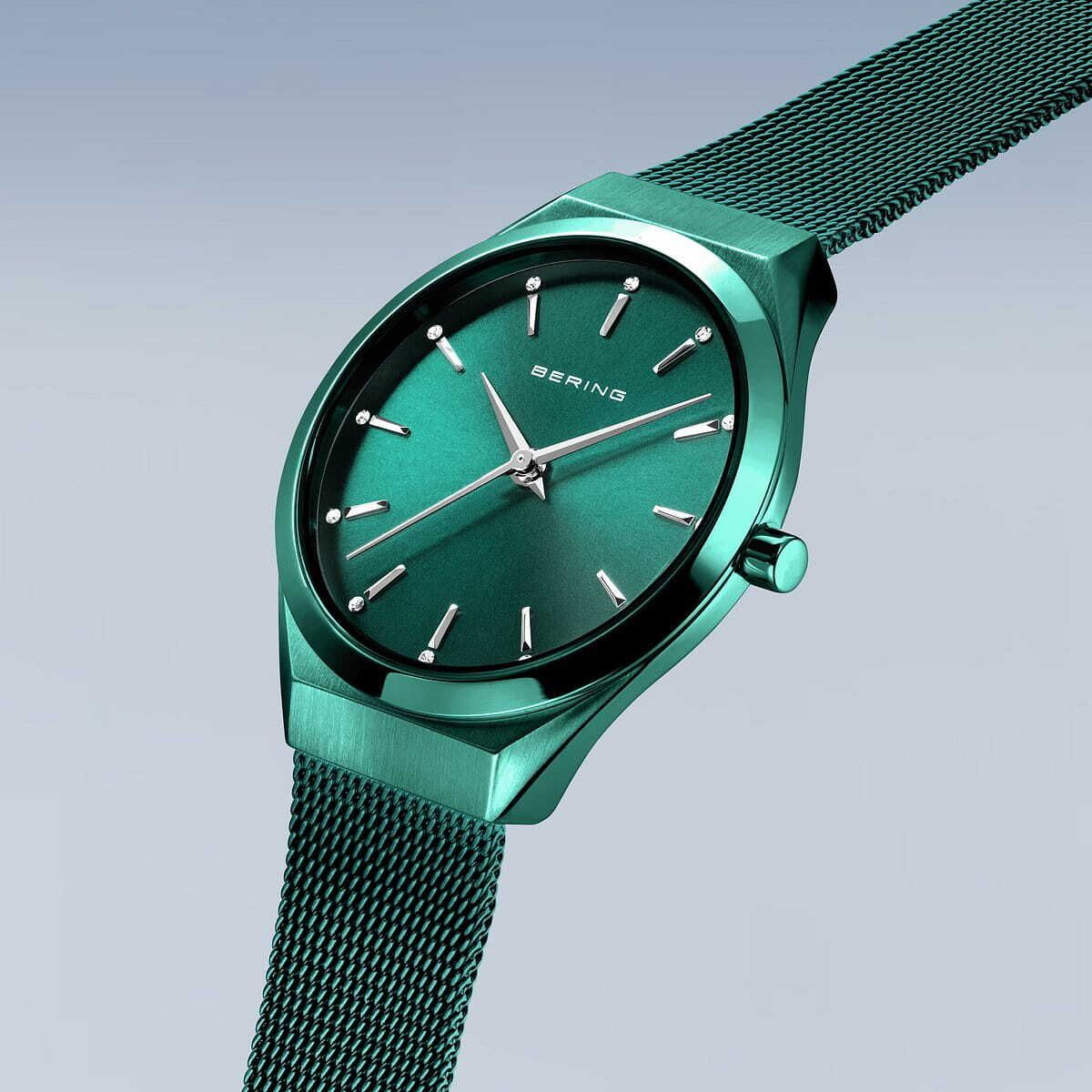 Женские кварцевые наручные часы с аналоговым отображением времени. Серия Classic Сollection Ultra Slim 5.2. Благодаря толщине всего в несколько миллиметров, Ultra Slim являются одними из самых тонких часов Bering на сегодняшний день и одними из самых тонких часов на рынке. Механизм Miyota 9T33. Центральные часовая, минутная и секундная стрелки серебристого цвета. Зелёный циферблат с часовыми метками в виде серебристых штрихов и кристаллов. Круглый стальной полированный корпус с зелёным IP покрытием. Диаметр корпуса 29 мм, толщина 5 мм. Устойчивое к возникновению мелких царапин плоское сапфировое стекло. Стальной браслет миланского плетения с зелёным IP покрытием. Ширина браслета 14 мм, длина браслета 180 мм. Раскладывающаяся застежка с предохранительной защелкой. Водонепроницаемость WR30 (защита от брызг).