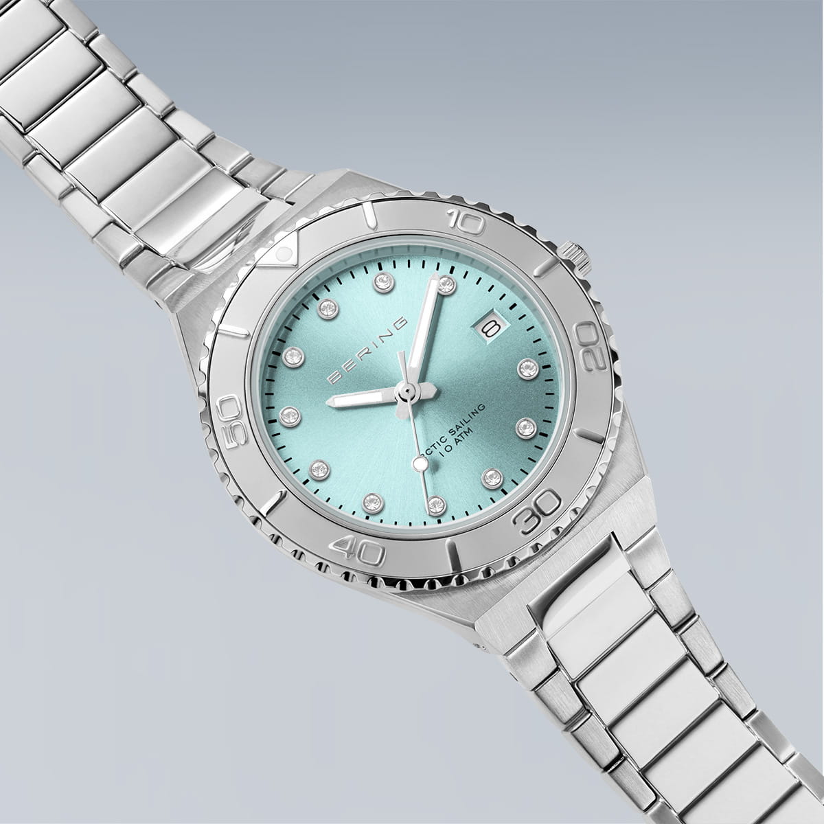 Женские кварцевые наручные часы с аналоговым отображением времени (стрелочные). Серия Classic Сollection Arctic Sailing. Часы сочетают в себе скандинавскую элегантность и спортивный дизайн. Голубой циферблат, вдохновленный глубиной арктических вод с часовыми метками в виде кристаллов, добавляет к спортивному характеру часов нотку гламура. Механизм Miyota 9U13. Центральные часовая, минутная и секундная стрелки. Стрелки с люминесцентным покрытием, которое светится в темноте после непродолжительного воздействия света. Голубой циферблат с эффектом солнечных лучей и с часовыми метками в виде кристаллов. Индикация даты в положении 3 часов. Круглый стальной корпус. Минутная шкала на рифлёном безеле. Диаметр корпуса 36 мм, толщина 8 мм. Устойчивое к возникновению мелких царапин плоское сапфировое стекло. Стальной браслет с раскладывающейся застежкой "бабочкой". Ширина браслета 18 мм, длина браслета 145 мм. Водонепроницаемость WR100 (часы подходят для плавания с маской, трубкой, обычного плавания).