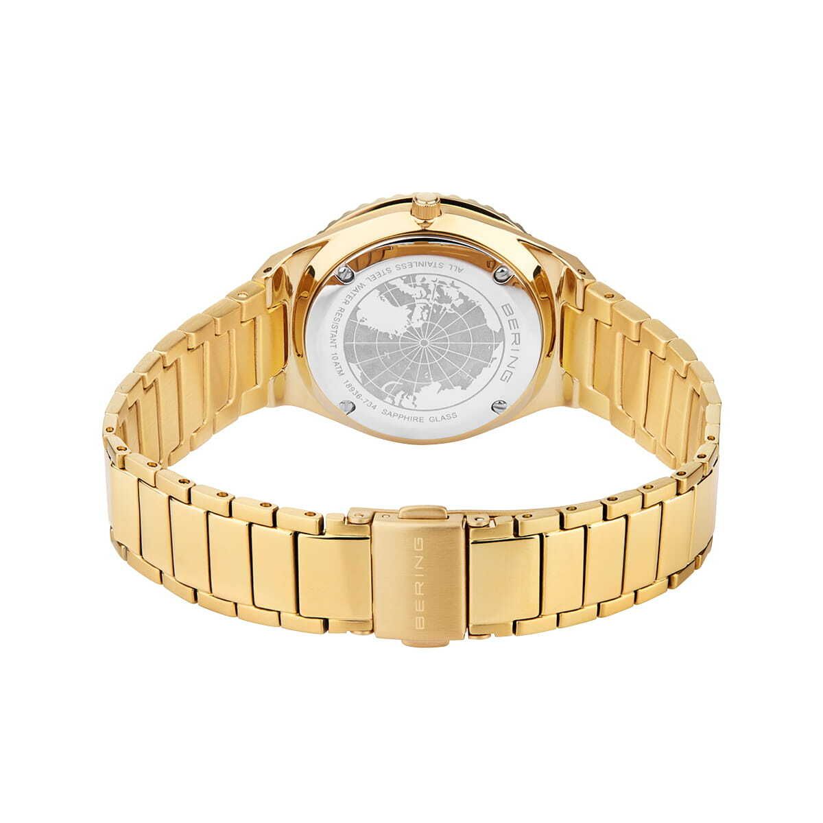 Женские кварцевые наручные часы с аналоговым отображением времени. Коллекция Arctic Sailing. Серия посвящена выдающемуся российскому мореплавателю, офицеру российского флота, капитану-командору Витусу Берингу, исследователю северных земель и морей. Механизм Miyota 9U13. Центральные часовая, минутная и секундная стрелки. Стрелки с люминесцентным покрытием, которое светится в темноте после непродолжительного воздействия света. Белый циферблат с часовыми метками в виде кристаллов. Окошко даты в положении 3 часов. Круглый стальной корпус с IP покрытием цвета жёлтое золото. Минутная шкала на безеле. Диаметр корпуса 36 мм, толщина 8 мм. Устойчивое к возникновению мелких царапин плоское сапфировое стекло. Стальной браслет с IP покрытием цвета жёлтое золото, раскладывающаяся застежка. Ширина браслета 18 мм, длина браслета 145 мм. Водонепроницаемость 100WR (часы подходят для плавания с маской, трубкой, обычного плавания).