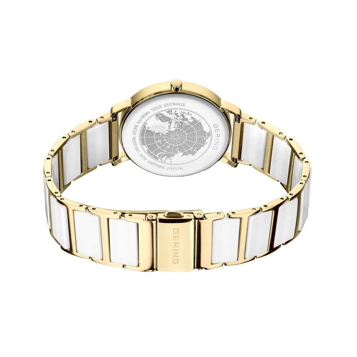 Женские кварцевые аналоговые наручные часы на солнечной батарее. Коллекция Slim Solar. Механизм Epson AS01AM. Центральные часовая, минутная и секундная стрелки золотистого цвета. Белый циферблат с часовыми метками в виде золотистых штрихов. Питание от солнечной энергии (не нужно менять батарейки) - источником питания служит светочувствительная панель и аккумулятор, заряжаемый при попадании солнечного света на циферблат часов. Запас хода при полностью заряженной батарее от 6 до 12 месяцев. Круглый стальной полированный корпус с IP покрытием цвета жёлтого золота. Диаметр корпуса 35 мм, толщина 8 мм. Устойчивое к возникновению мелких царапин плоское сапфировое стекло. Стальной браслет с IP покрытием цвета жёлтого золота и керамическими вставками белого цвета. Ширина браслета 18 мм, длина браслета 150 мм. Водонепроницаемость WR30 (защита от брызг).